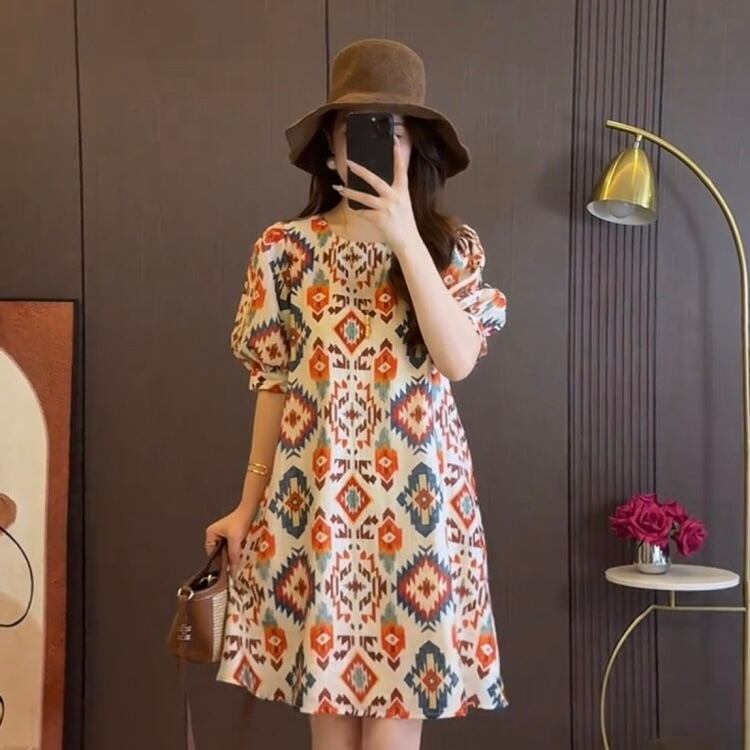 【送料無料】 レディース ワンピース Aライン クルーネック ショート丈 ミドル丈 ミディアム丈 シンプル きれいめ 大人かわいい キュート レトロ こなれ感 体型カバー 二の腕カバー スタイルアップ 半袖 半端袖 5分袖 ふんわり袖 バルーンスリーブ プリント アイボリー 20代 30代 40代 通勤 通学 オフィス お出掛け 女子会 お呼ばれ 春夏