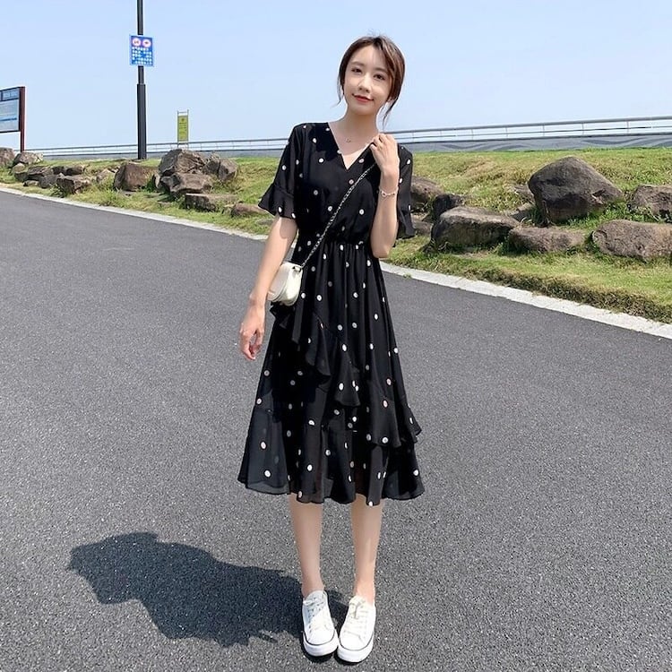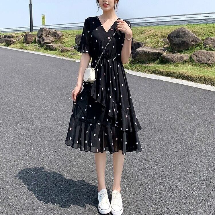 【送料無料】 レディース ワンピース Aライン Vネック ミドル丈 ミディアム丈 ミモレ丈 アシンメトリー ドット 水玉 フリル ギャザー シンプル きれいめ 大人かわいい キュート レトロ こなれ感 体型カバー 二の腕カバー スタイルアップ 半袖 フレアスリーブ ブラック 20代 30代 40代 通勤 通学 オフィス お出掛け 女子会 お呼ばれ 春夏