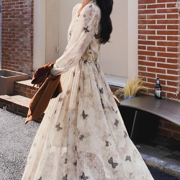 【送料無料】 レディース ワンピース Aライン クルーネック シアー感 透け感 ロング丈 マキシ丈 シンプル きれいめ プリント バタフライ ふんわり袖 大人かわいい キュート レトロ こなれ感 体型カバー 二の腕カバー スタイルアップ 長袖 アイボリー 20代 30代 40代 通勤 通学 オフィス お出掛け 女子会 お呼ばれ 春夏