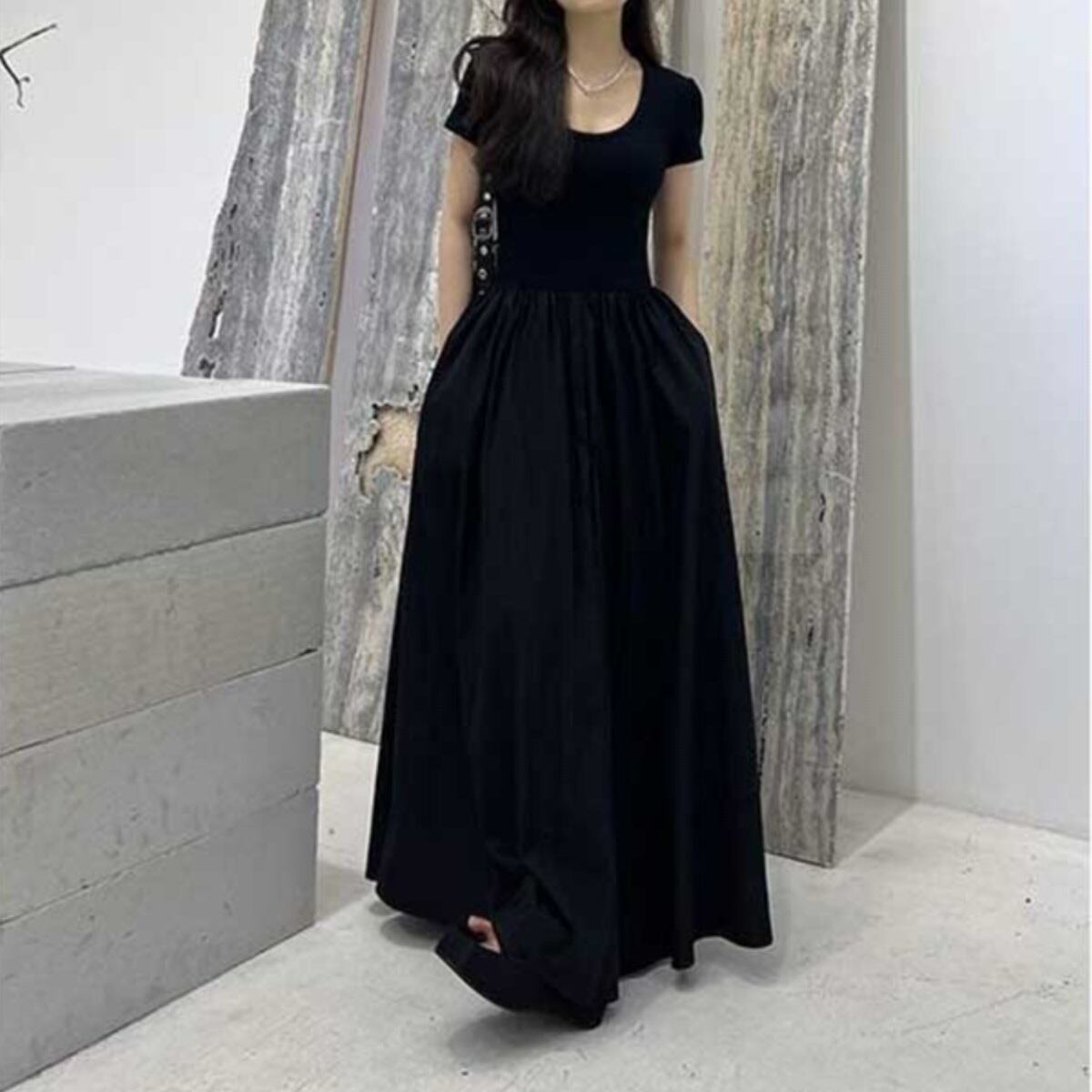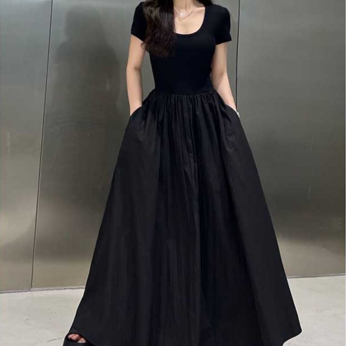【送料無料】 レディース ワンピース Aライン クルーネック ロング丈 マキシ丈 シンプル きれいめ 大人かわいい キュート レトロ こなれ感 体型カバー 二の腕カバー スタイルアップ 半袖 ブラック 20代 30代 40代 通勤 通学 オフィス お出掛け 女子会 お呼ばれ 春夏