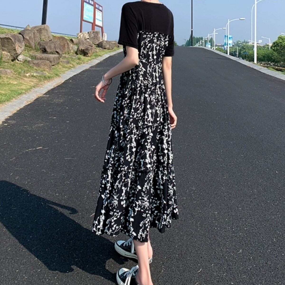 【送料無料】 レディース ワンピース Aライン クルーネック カラー切り替え カラーブロック ドッキング 素材組み合わせ ミモレ丈 ロング丈 マキシ丈 シンプル きれいめ 大人かわいい キュート レトロ こなれ感 体型カバー 二の腕カバー スタイルアップ プリント 半袖 ブラック 20代 30代 40代 通勤 通学 オフィス お出掛け 女子会 お呼ばれ 春夏