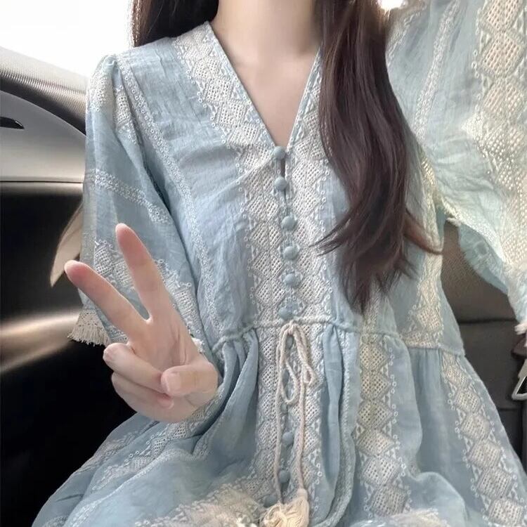 【送料無料】 レディース ワンピース Aライン Vネック ロング丈 マキシ丈 シンプル きれいめ 大人かわいい キュート レトロ こなれ感 体型カバー 二の腕カバー スタイルアップ カラー切り替え カラーブロック ドッキング 素材組み合わせ ゆったり ストライプ フレアスリーブ 半端袖 5分袖 ブルー 20代 30代 40代 通勤 通学 お出掛け 女子会 お呼ばれ 春夏