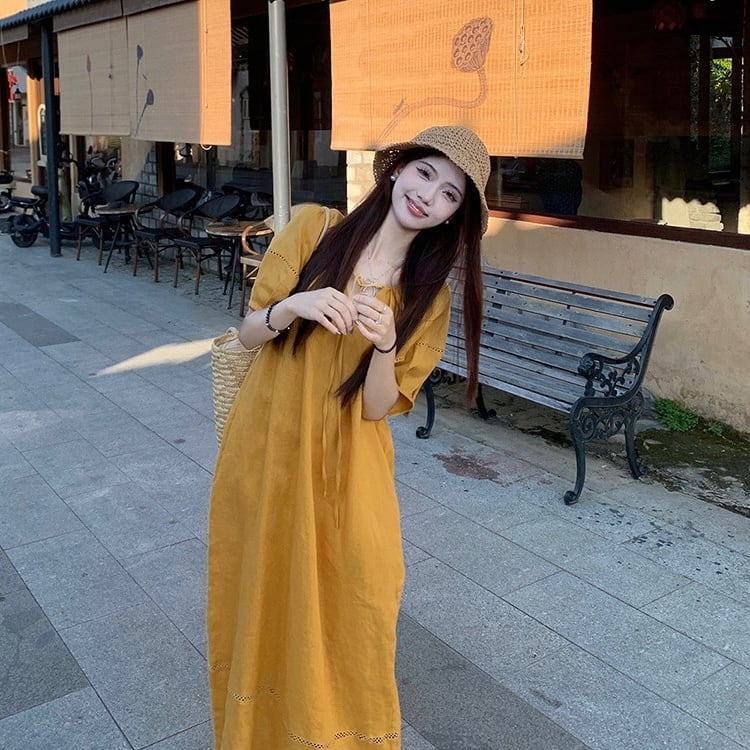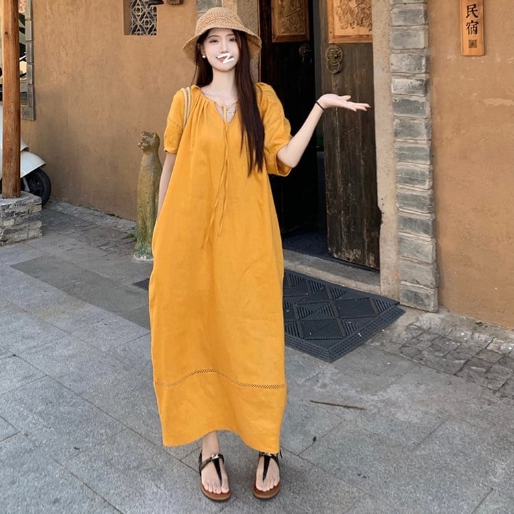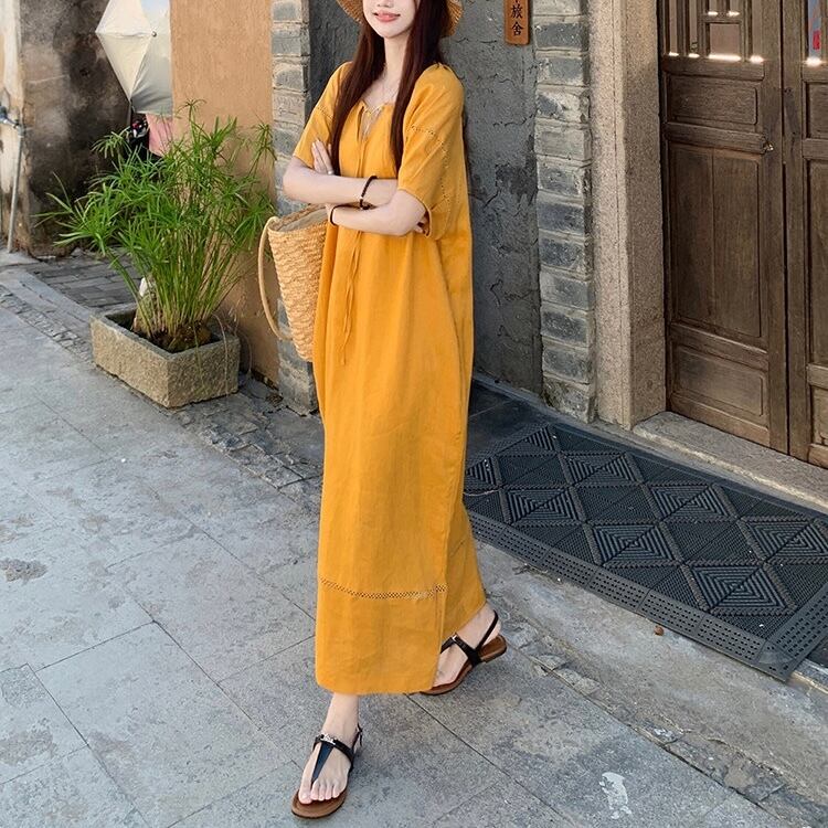 【送料無料】 レディース ワンピース Vネック ゆったり ナチュラル ロング丈 マキシ丈 シンプル きれいめ 大人かわいい キュート レトロ こなれ感 体型カバー 二の腕カバー スタイルアップ 半袖 イエロー 20代 30代 40代 通勤 通学 オフィス お出掛け 女子会 お呼ばれ 春夏