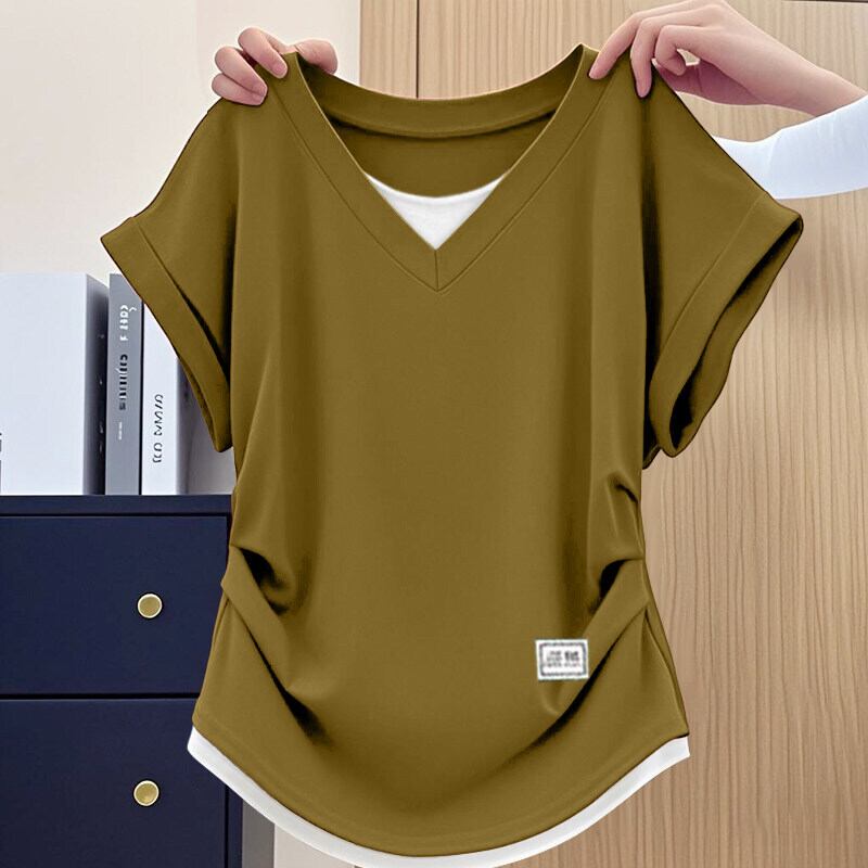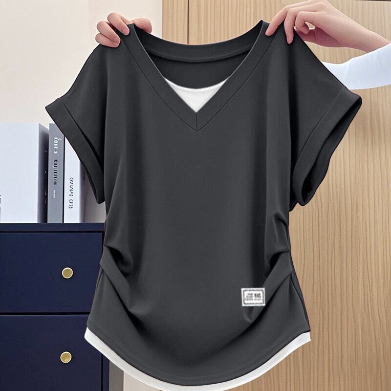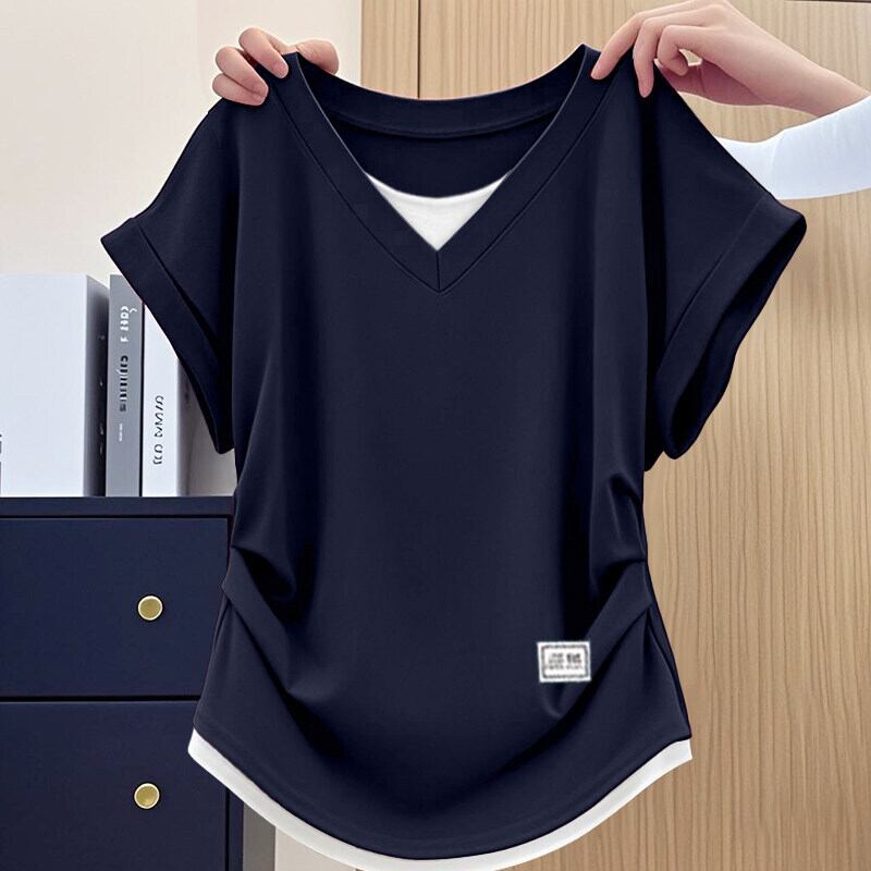 【送料無料】 レディース トップス ニット カットソー クルーネック フェイクレイヤード 重ね着風 カラー切り替え カラーブロック シンプル カジュアル きれいめ 大人かわいい こなれ感 キュート 体型カバー 二の腕カバー スタイルアップ ネイビー グリーン グレー パープル ブラック 半袖 20代 30代 40代 通勤 通学 オフィス お出掛け 女子会 お呼ばれ 春夏