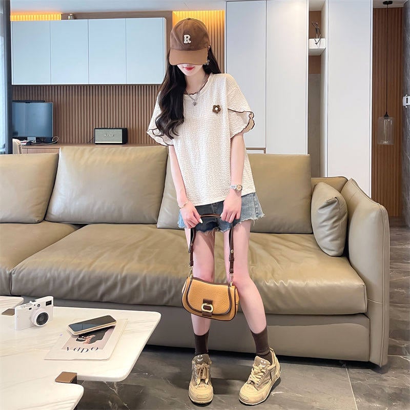 【送料無料】 レディース トップス カットソー クルーネック フリル ワンポイント モチーフ フラワー キュート シンプル カジュアル きれいめ 大人かわいい 体型カバー 二の腕カバー スタイルアップ 半袖 アイボリー カーキ ピンク グリーン ブルー 20代 30代 40代 通勤 通学 オフィス お出掛け 女子会 お呼ばれ 春夏