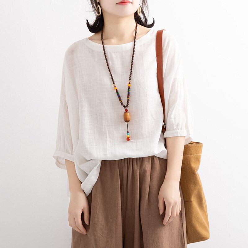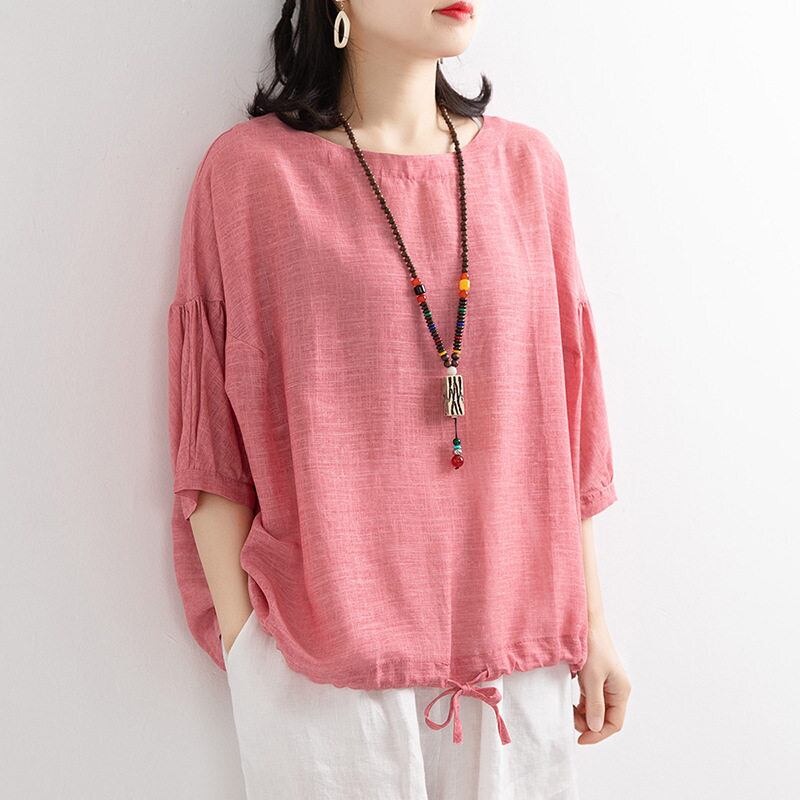 【送料無料】 レディース トップス ブラウス クルーネック ナチュラル ふんわり袖 ゆったり シンプル カジュアル きれいめ 大人かわいい 体型カバー 二の腕カバー スタイルアップ こなれ感 半袖 半端袖 5分袖 ピンク ホワイト ブラウン ブルー グリーン パープル 20代 30代 40代 通勤 通学 オフィス お出掛け 女子会 お呼ばれ 春夏