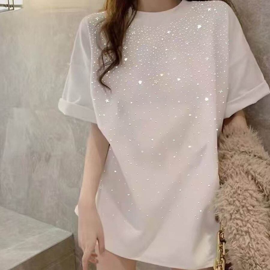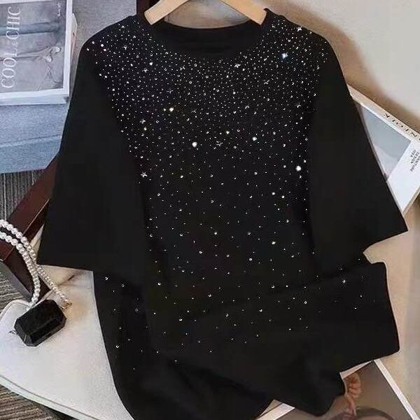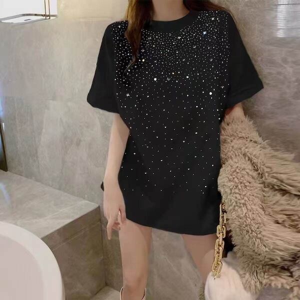 【送料無料】 レディース トップス カットソー クルーネック ゆったり キラキラ スパンコール シンプル カジュアル きれいめ 大人かわいい 体型カバー 二の腕カバー スタイルアップ 抜け感 半袖 ホワイト ブラック 20代 30代 40代 通勤 通学 オフィス お出掛け 女子会 お呼ばれ 春夏