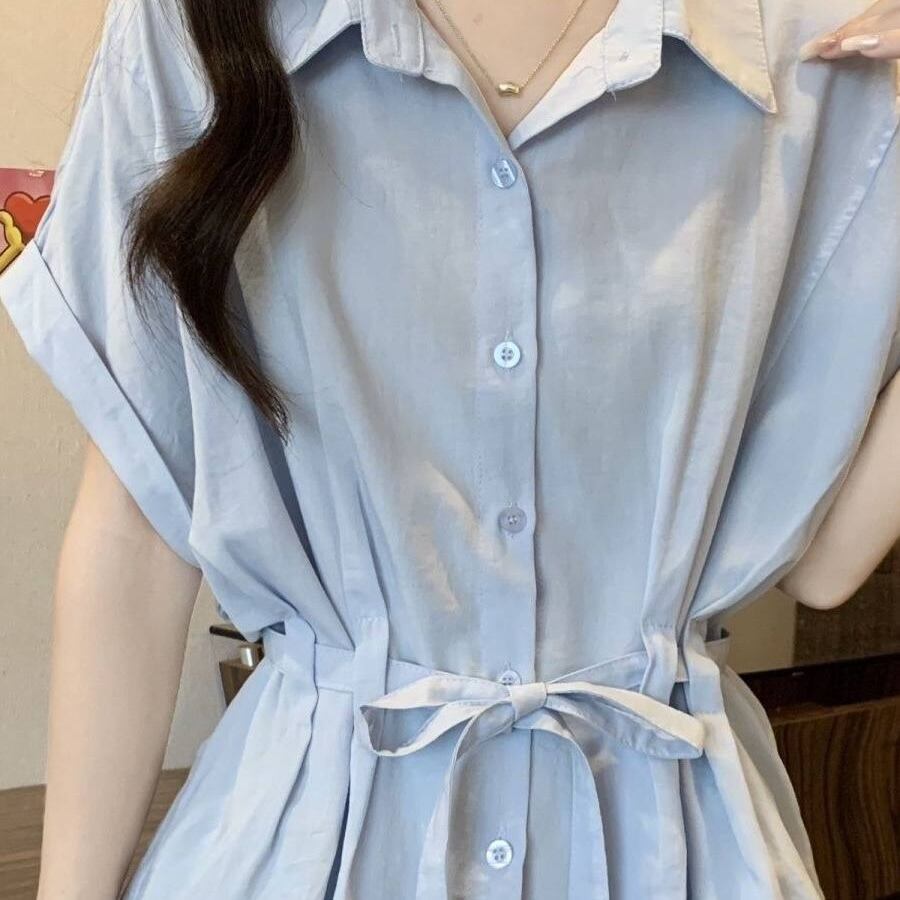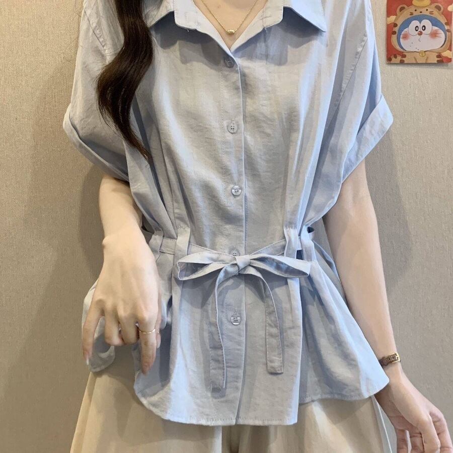 【送料無料】 レディース トップス シャツ ブラウス クルーネック ウエストシェイプ ウエストマーク ゆったり 体型カバー 二の腕カバー スタイルアップ シンプル カジュアル きれいめ 大人かわいい こなれ感 抜け感 半袖 ブルー 20代 30代 40代 通勤 通学 オフィス お出掛け 女子会 お呼ばれ 春夏