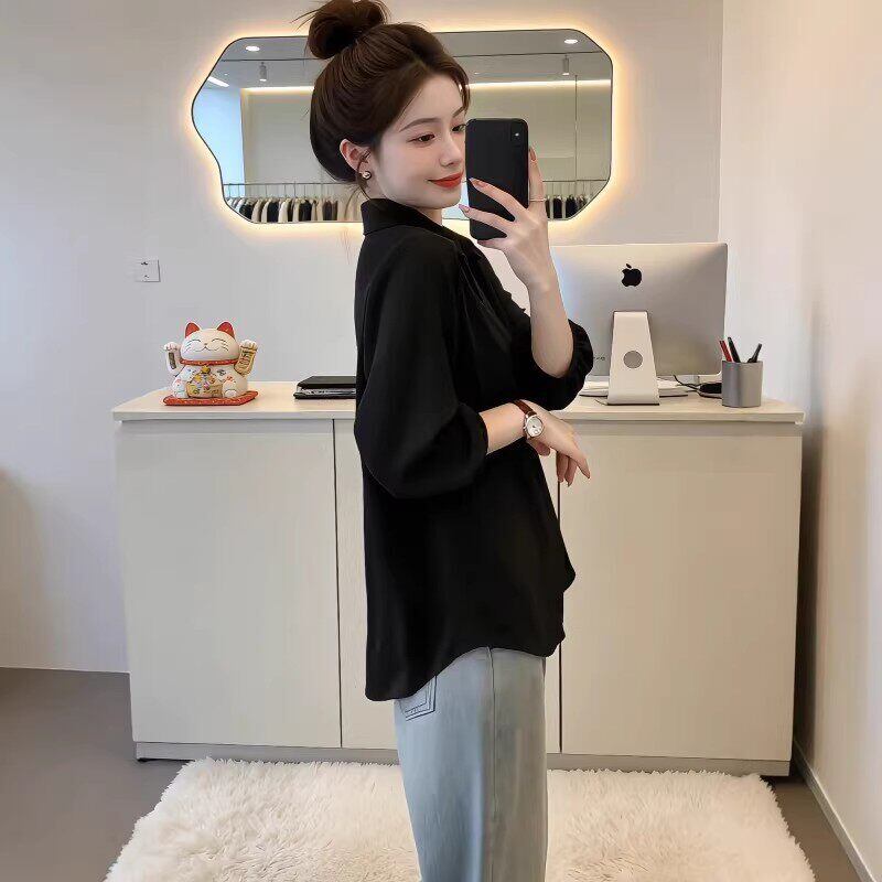 【送料無料】 レディース トップス シャツ ブラウス Vネック ふんわり袖 シアー感 シンプル カジュアル きれいめ 大人かわいい 体型カバー 二の腕カバー スタイルアップ こなれ感 抜け感 半端袖 7分袖 ブラック 20代 30代 40代 通勤 通学 オフィス お出掛け 女子会 お呼ばれ 春夏