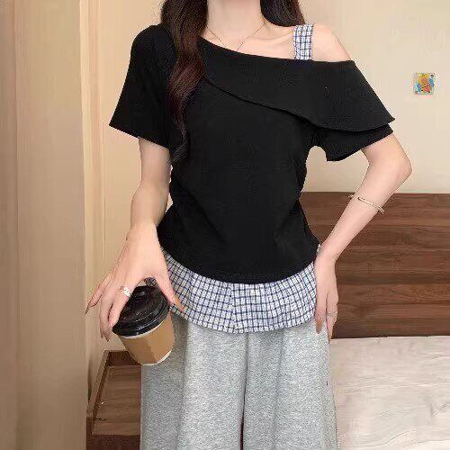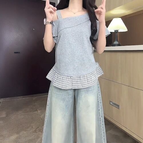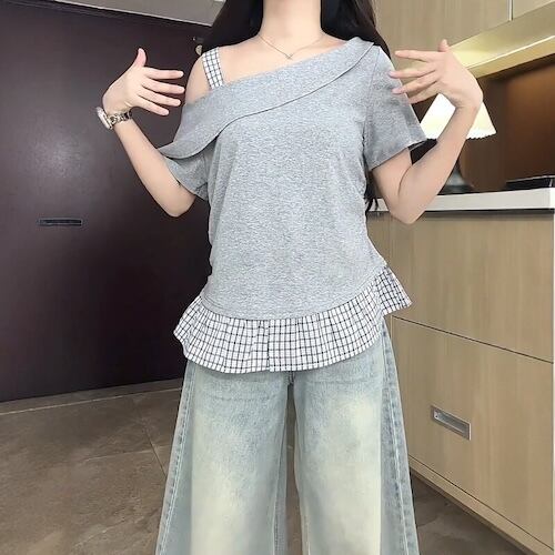 【送料無料】 レディース トップス カットソー クルーネック スクエアネック アシンメトリー オフショルダー ドッキング 素材組み合わせ カラー切り替え カラーブロック シンプル カジュアル きれいめ 大人かわいい 体型カバー 二の腕カバー スタイルアップ こなれ感 半袖 グレー ベージュ ブラッ 20代 30代 40代 通勤 通学 オフィス お出掛け 女子会 お呼ばれ 春夏