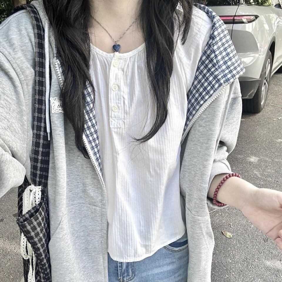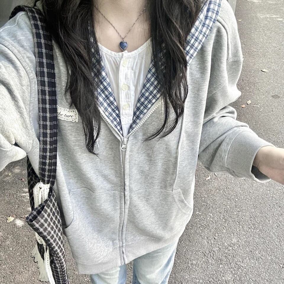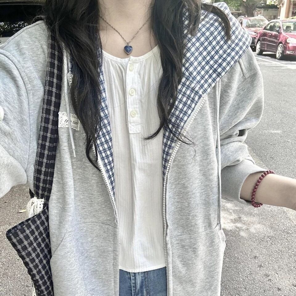 【送料無料】 レディース アウター 防寒 羽織り ジャケット カラー切り替え カラーブロック チェック パーカー クルーネック シンプル カジュアル きれいめ 大人かわいい 体型カバー 二の腕カバー スタイルアップ こなれ感 抜け感 キュート 長袖 グレー 20代 30代 40代 通勤 通学 オフィス お出掛け 女子会 お呼ばれ 春夏
