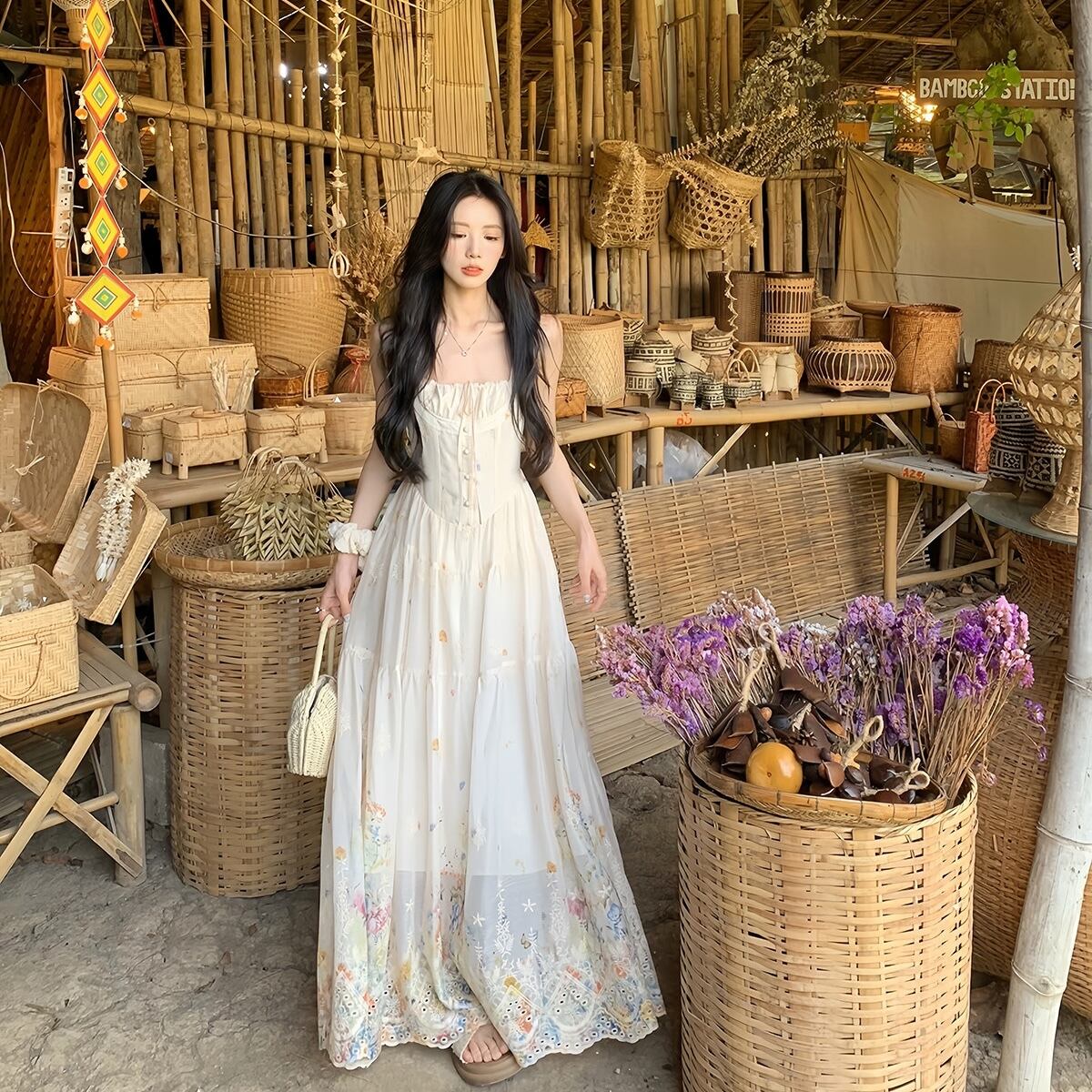 【送料無料】 レディース ドレス パーティードレス ワンピース Aライン キャミソールドレス スクエアネック エンブロイダリー パンチング ロング丈 マキシ丈 シンプル きれいめ 大人かわいい キュート レトロ こなれ感 体型カバー 二の腕カバー スタイルアップ ホワイト 結婚式 2次会 お呼ばれ パーティー お食事会 ディナー ランチ お出かけ 春夏