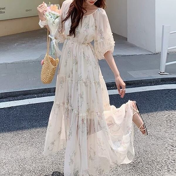 【送料無料】 レディース ワンピース Aライン クルーネック ロング丈 マキシ丈 シンプル きれいめ 大人かわいい キュート レトロ こなれ感 体型カバー 二の腕カバー スタイルアップ シアー感 透け感 ふんわり袖 半袖 半端袖 5分袖 アイボリー 20代 30代 40代 通勤 通学 お出掛け 女子会 お呼ばれ 春夏