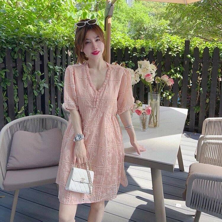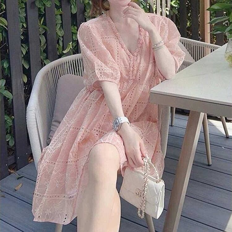 【送料無料】 レディース ワンピース Aライン Vネック レース ミニ丈 ショート丈 ミドル丈 シンプル きれいめ 大人かわいい ふんわり袖 キュート レトロ こなれ感 体型カバー 二の腕カバー スタイルアップ 半袖 半端袖 5分袖 アイボリー ピンク 20代 30代 40代 通勤 通学 オフィス お出掛け 女子会 お呼ばれ 春夏
