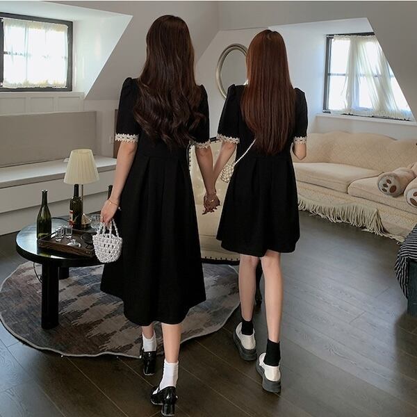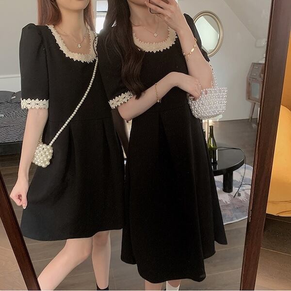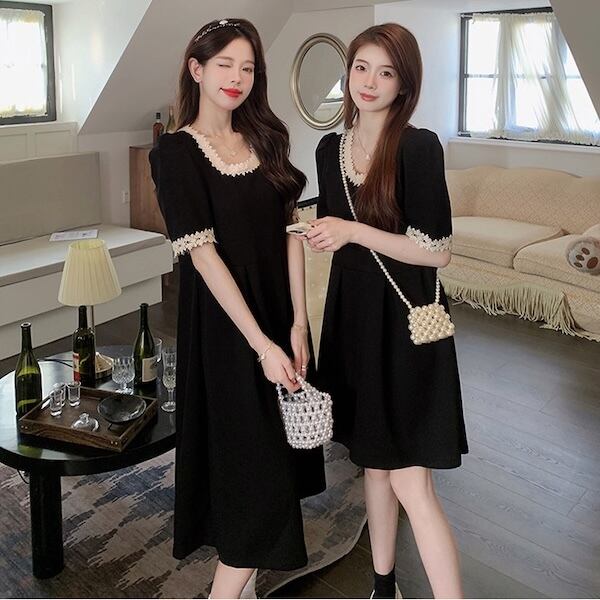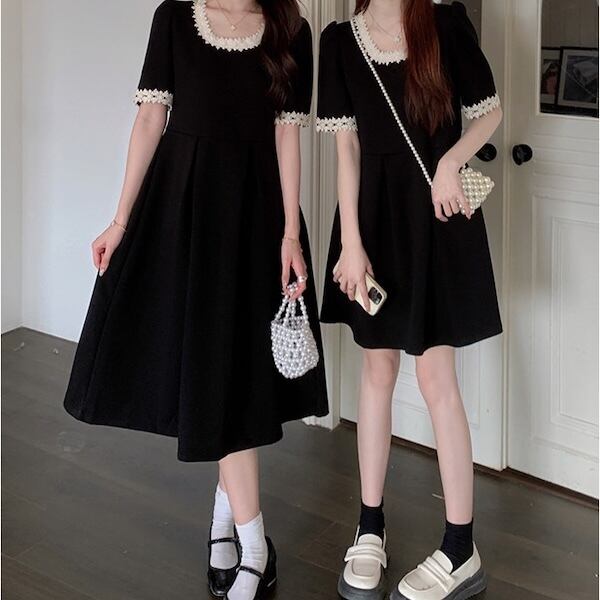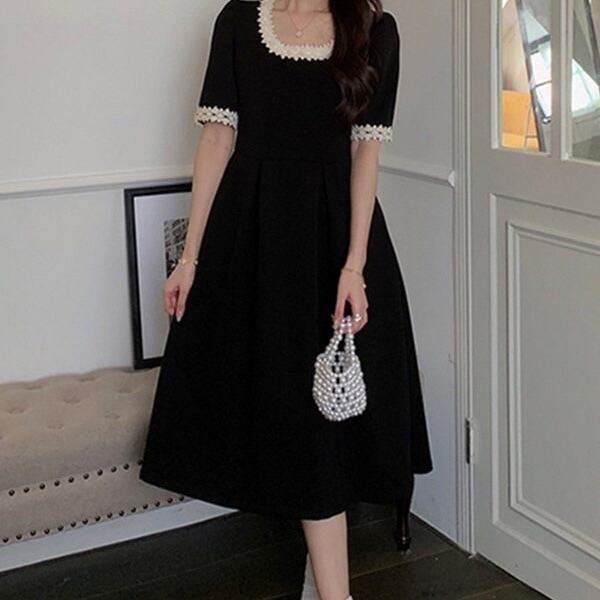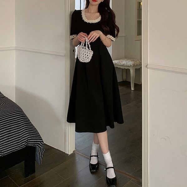 【送料無料】 レディース ワンピース Aライン スクエアネック パール ビジュー ミニ丈 ショート丈 ミドル丈 ミディアム丈 シンプル きれいめ 大人かわいい キュート レトロ こなれ感 体型カバー 二の腕カバー スタイルアップ 半袖 モノトーン ブラック 20代 30代 40代 通勤 通学 オフィス お出掛け 女子会 お呼ばれ 春夏