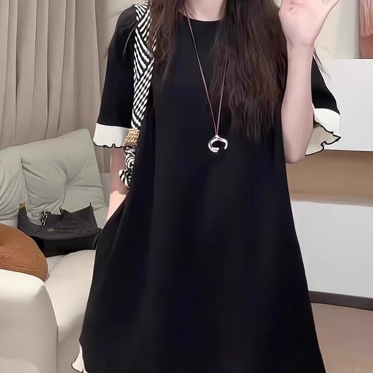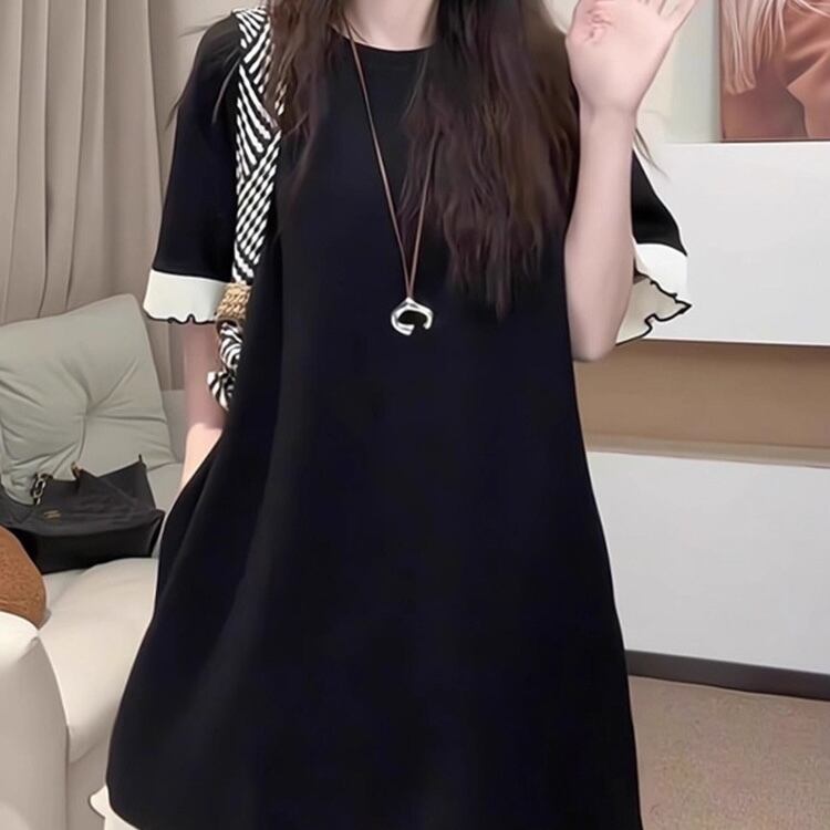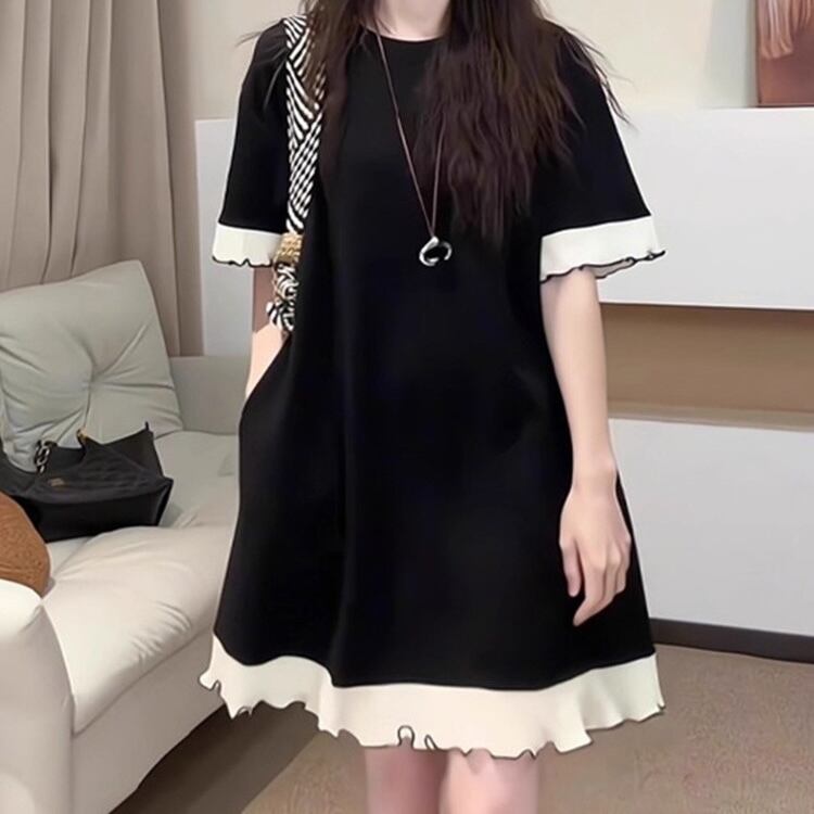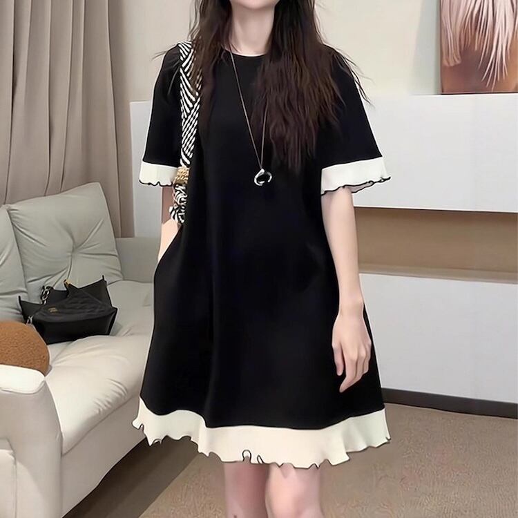 【送料無料】 レディース ワンピース Aライン クルーネック モノトーン フリル ゆったり ミドル丈 ミディアム丈 ミモレ丈 ロング丈 マキシ丈 シンプル きれいめ 大人かわいい キュート レトロ こなれ感 体型カバー 二の腕カバー スタイルアップ 半袖 ブラック