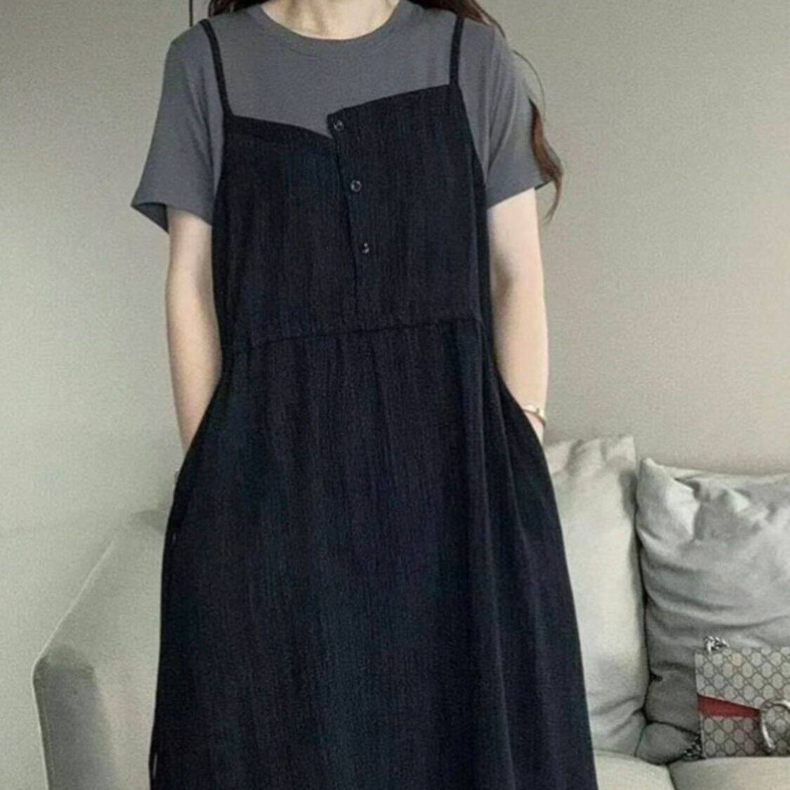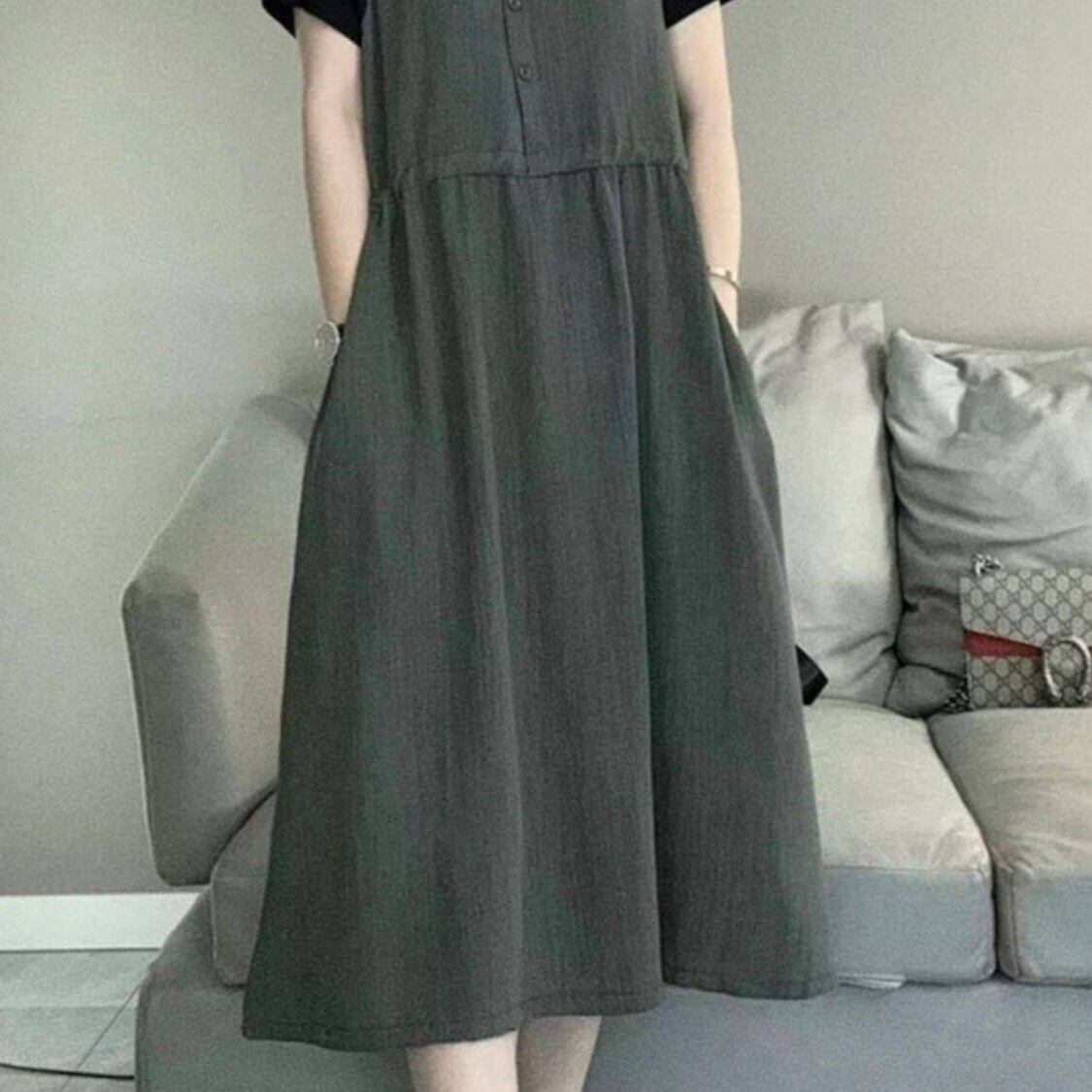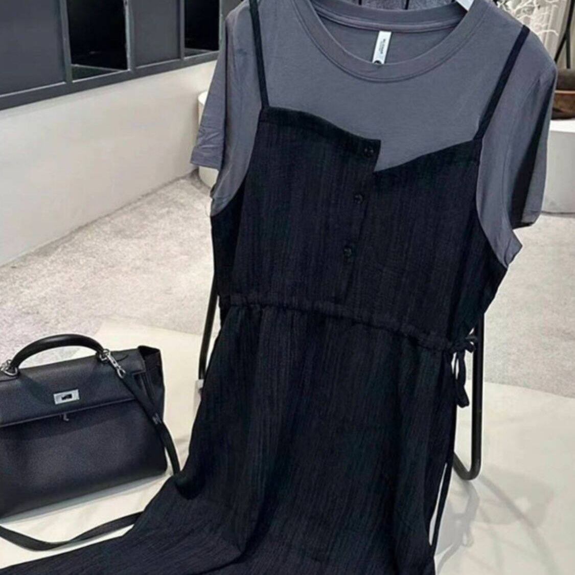 【送料無料】 レディース ワンピース Aライン クルーネック フェイクレイヤード 重ね着風 カラー切り替え カラーブロック ミドル丈 ミディアム丈 ミモレ丈 モノトーン きれいめ 大人かわいい キュート レトロ こなれ感 体型カバー 二の腕カバー スタイルアップ 半袖 グレー ブラック 20代 30代 40代 通勤 通学 オフィス お出掛け 女子会 お呼ばれ 春夏