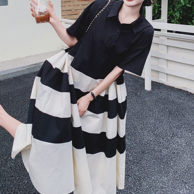 【送料無料】 レディース ワンピース Aライン クルーネック カラー切り替え カラーブロック モノトーン ロング丈 マキシ丈 シンプル きれいめ 大人かわいい キュート レトロ こなれ感 体型カバー 二の腕カバー スタイルアップ 半袖 ブラック 20代 30代 40代 通勤 通学 オフィス お出掛け 女子会 お呼ばれ 春夏