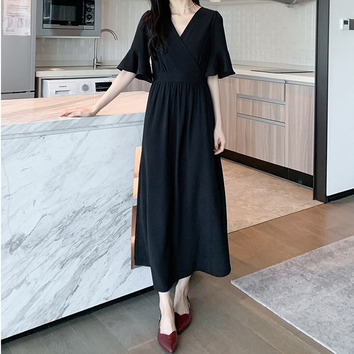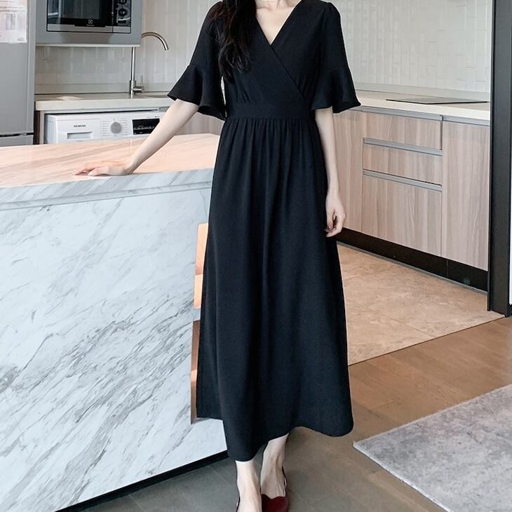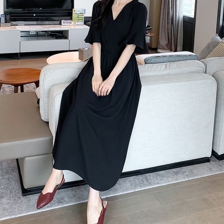 【送料無料】 レディース ワンピース Aライン カシュクール アシンメトリー Vネック ミディアム丈 ミモレ丈 ロング丈 シンプル きれいめ 大人かわいい キュート レトロ こなれ感 体型カバー 二の腕カバー スタイルアップ 半袖 ブラック 20代 30代 40代 通勤 通学 オフィス お出掛け 女子会 お呼ばれ 春夏