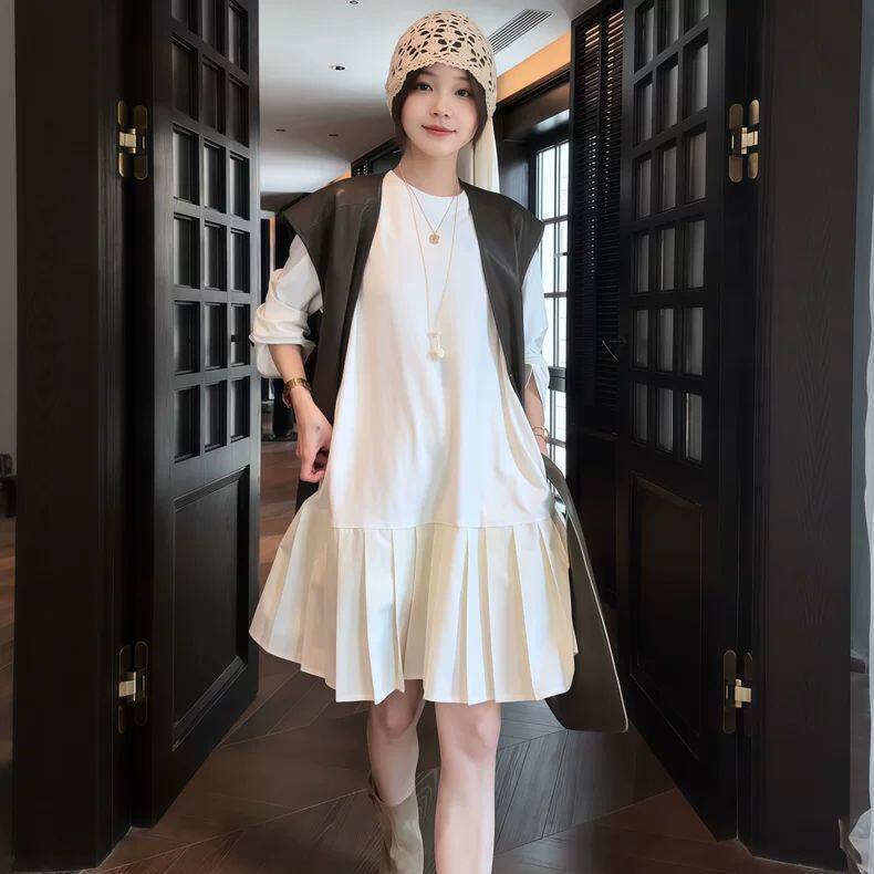 【送料無料】 レディース ワンピース Aライン クルーネック ドッキング 素材組み合わせ プリーツ ミニ丈 ショート丈 マキシ丈 シンプル きれいめ 大人かわいい キュート レトロ こなれ感 体型カバー 二の腕カバー スタイルアップ 長袖 アイボリー ブラック 20代 30代 40代 通勤 通学 オフィス お出掛け 女子会 お呼ばれ 春夏