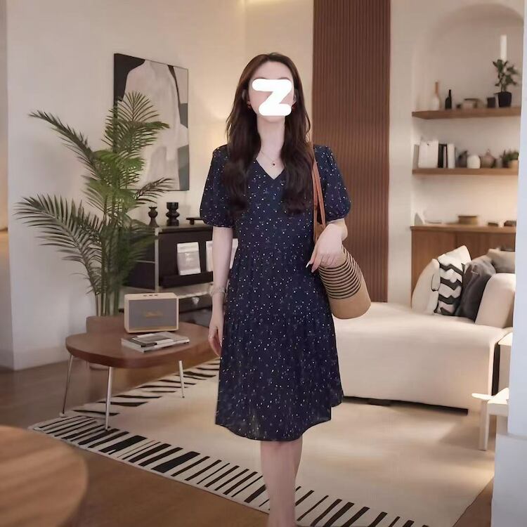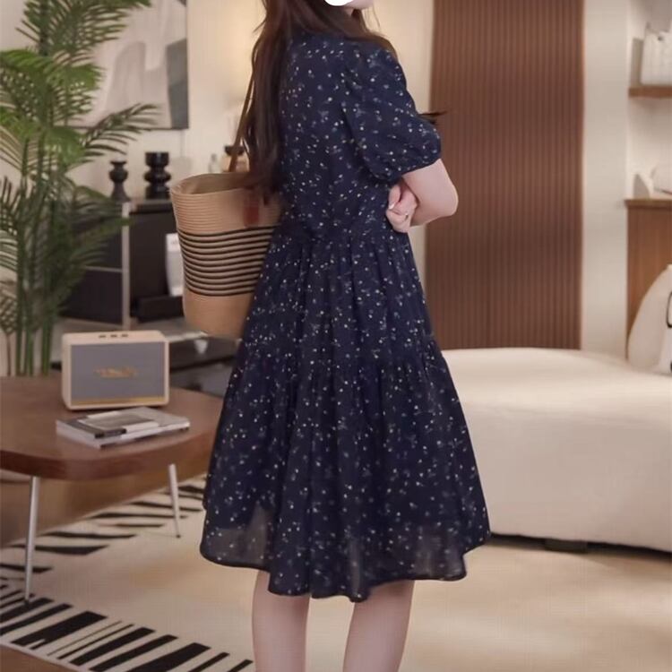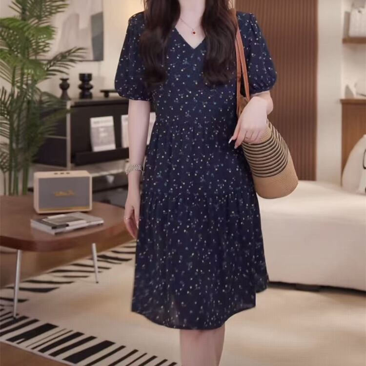 【送料無料】 レディース ワンピース Aライン Vネック ミニ丈 ショート丈 ミドル丈 プリント シンプル きれいめ 大人かわいい キュート レトロ こなれ感 体型カバー 二の腕カバー スタイルアップ 半袖 ネイビー 20代 30代 40代 通勤 通学 オフィス お出掛け 女子会 お呼ばれ 春夏