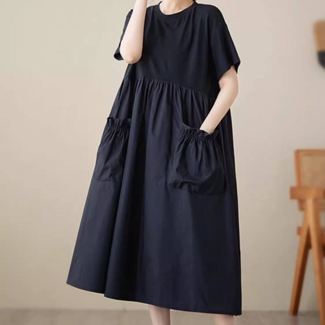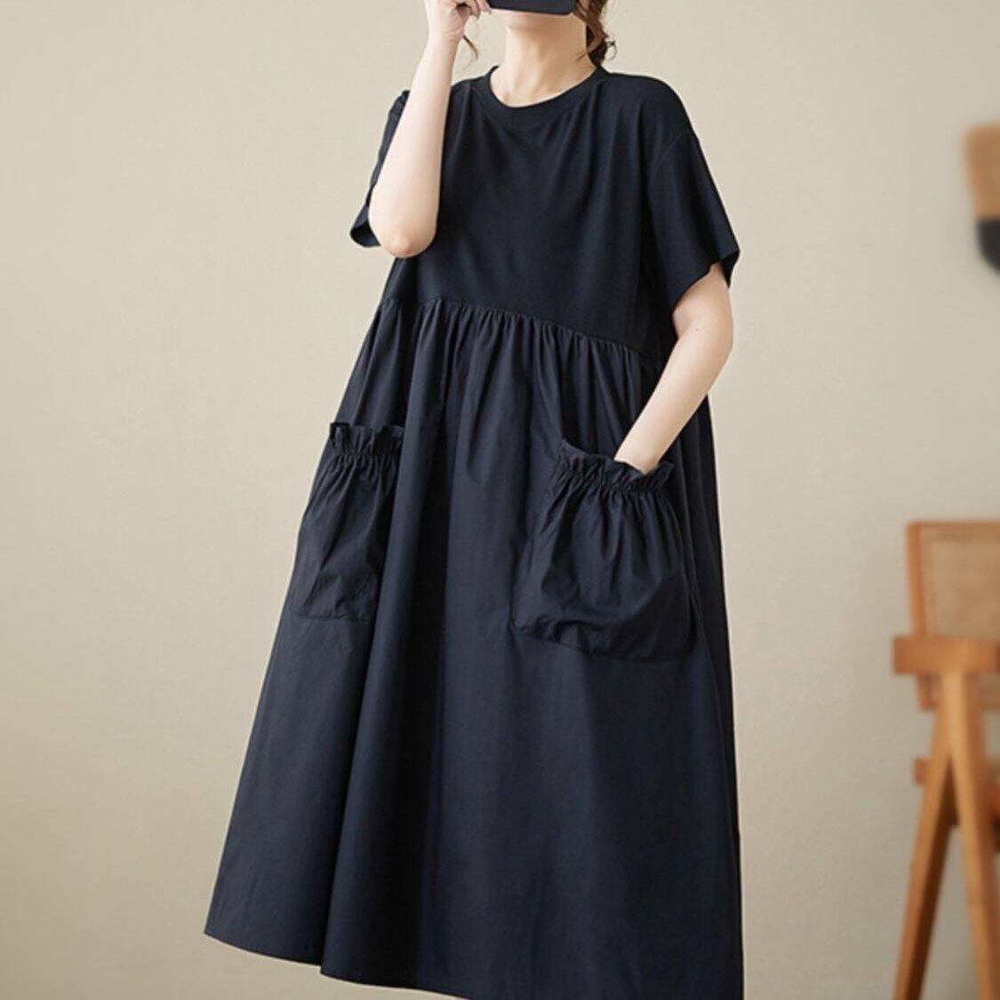 【送料無料】 レディース ワンピース Aライン クルーネック ゆったり ミドル丈 ミディアム丈 ミモレ丈 シンプル きれいめ 大人かわいい キュート レトロ こなれ感 体型カバー 二の腕カバー スタイルアップ 半袖 ブラック 20代 30代 40代 通勤 通学 オフィス お出掛け 女子会 お呼ばれ 春夏