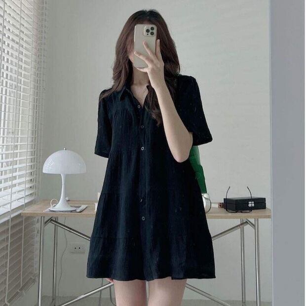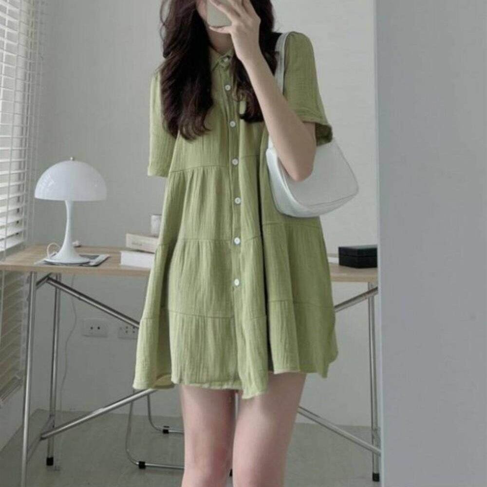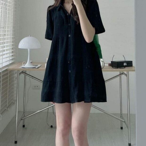 【送料無料】 レディース ワンピース Aライン クルーネック ティアード ミニ丈 ショート丈 シンプル きれいめ 大人かわいい キュート レトロ こなれ感 体型カバー 二の腕カバー スタイルアップ 半袖 グリーン ブラック 20代 30代 40代 通勤 通学 オフィス お出掛け 女子会 お呼ばれ 春夏
