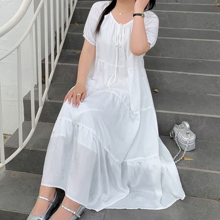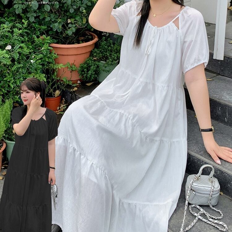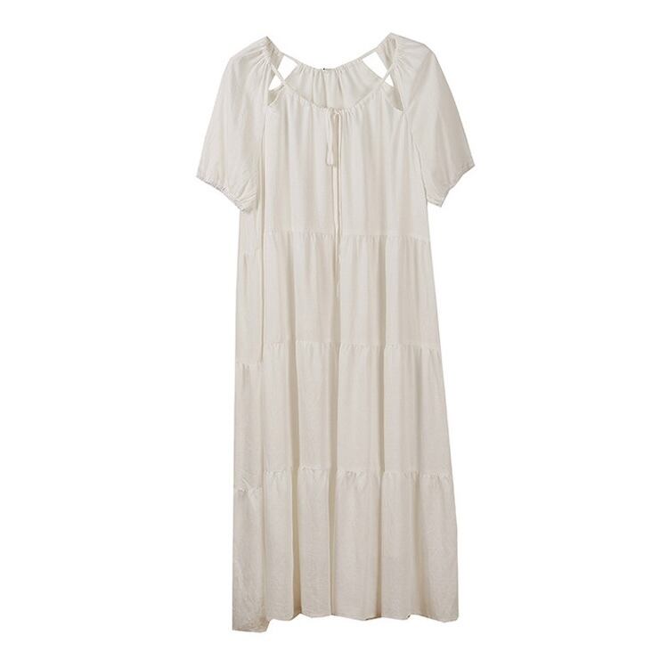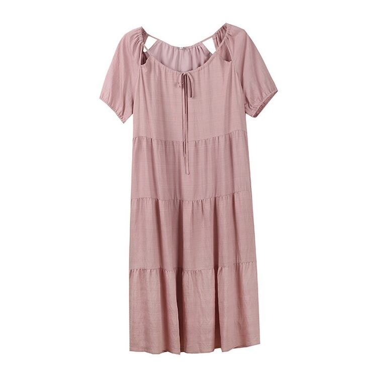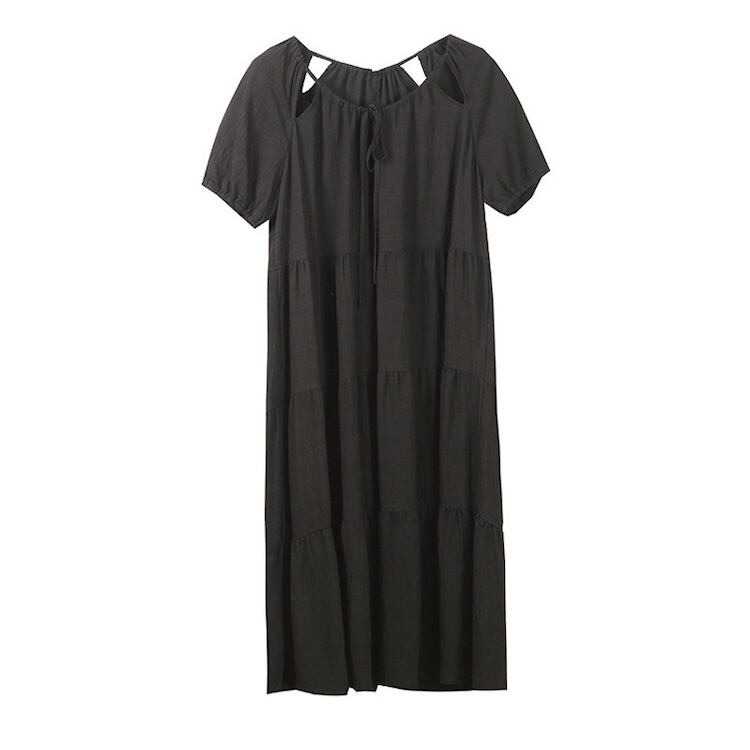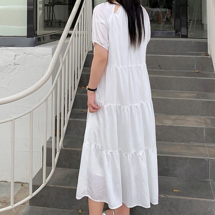 【送料無料】 レディース ワンピース Aライン クルーネック スリット ティアード ふんわり袖 ミドル丈 ミディアム丈 シンプル きれいめ 大人かわいい キュート レトロ こなれ感 体型カバー 二の腕カバー スタイルアップ 半袖 アイボリー ピンク ブラック 20代 30代 40代 通勤 通学 オフィス お出掛け 女子会 お呼ばれ 春夏