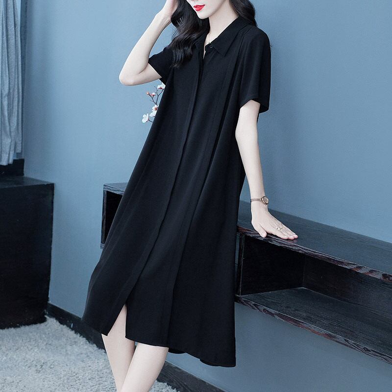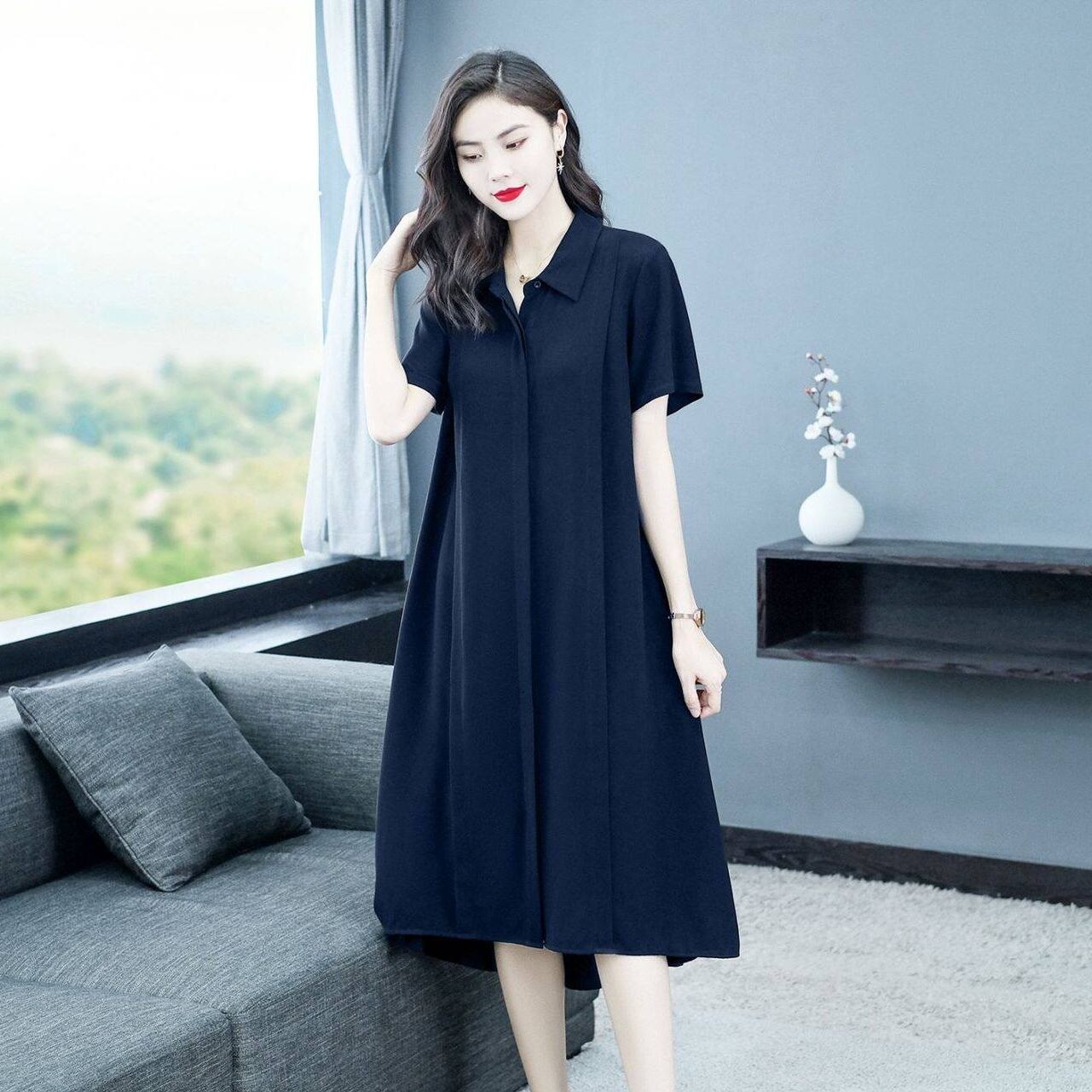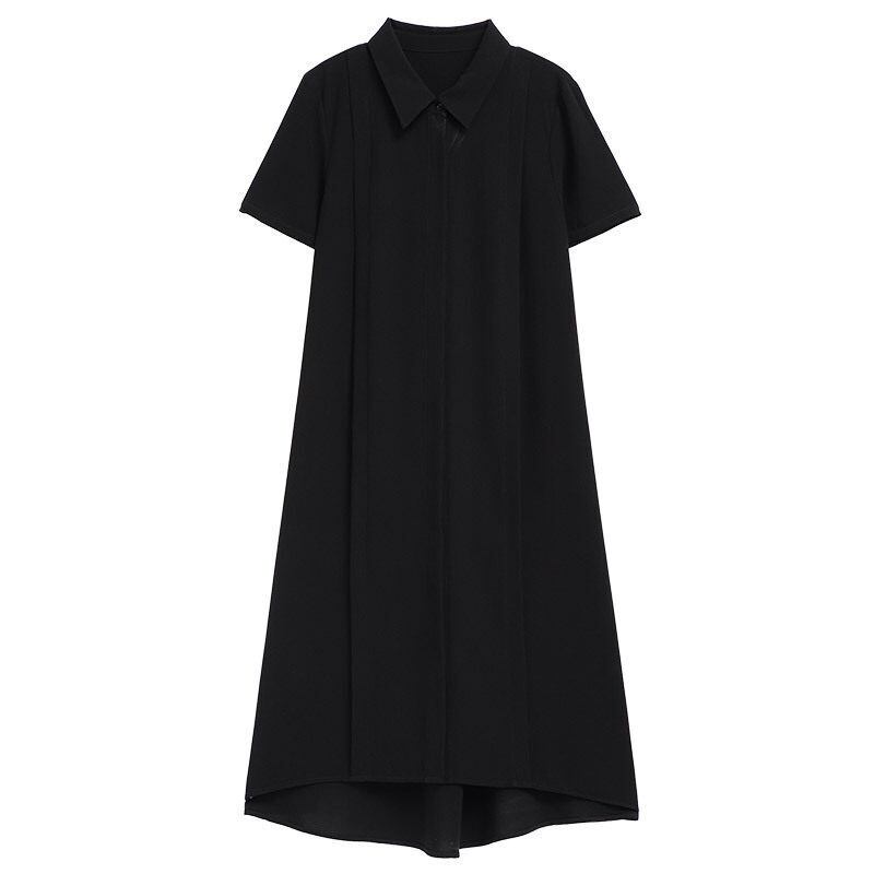 【送料無料】 レディース ワンピース Aライン クルーネック 後ろ下がり ショート丈 ミドル丈 ミディアム丈 ミモレ丈 シンプル きれいめ 大人かわいい キュート レトロ こなれ感 体型カバー 二の腕カバー スタイルアップ 半袖 ネイビー グリーン ブラック