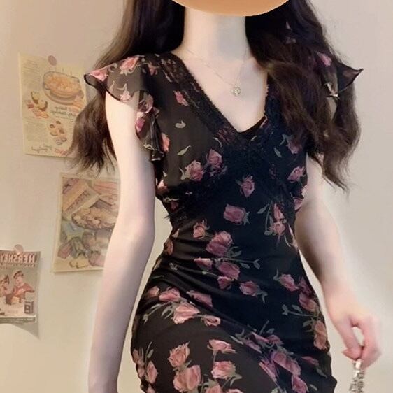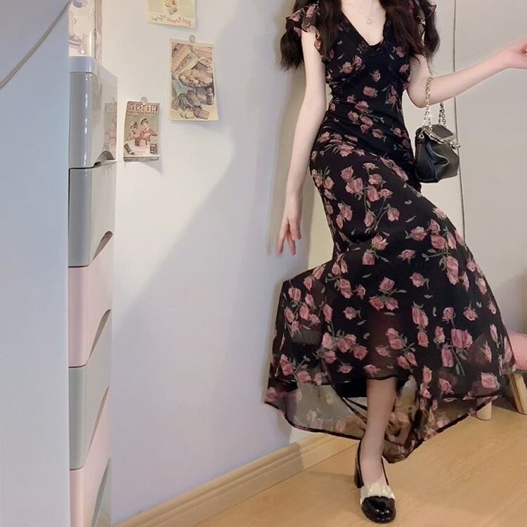【送料無料】 レディース ワンピース フリル プリント フラワー ボタニカル Vネック ミモレ丈 ロング丈 マキシ丈 シンプル きれいめ 大人かわいい キュート レトロ こなれ感 体型カバー 二の腕カバー スタイルアップ 半袖 フレンチスリーブ ブラック 20代 30代 40代 通勤 通学 オフィス お出掛け 女子会 お呼ばれ 春夏