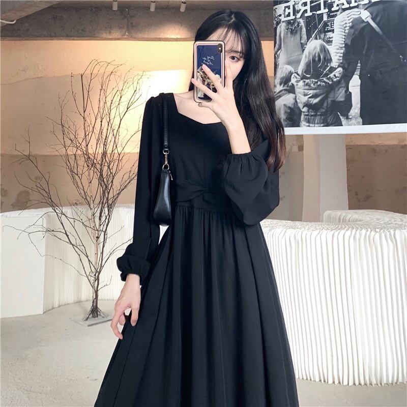 【送料無料】 Aラインドレス ロング丈 スクエアネック 長袖 パフスリーブ シック 大人 お呼ばれ 大きいサイズ