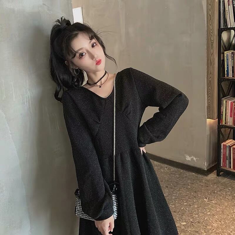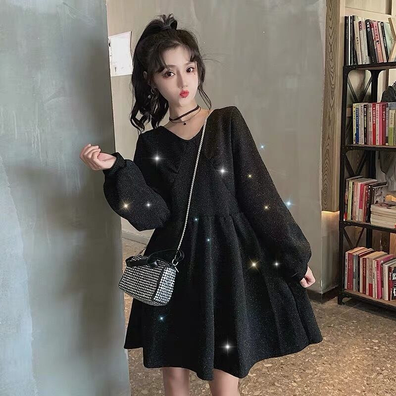 【送料無料】 フレアドレス ミニ丈 Vネック 長袖 パフスリーブ 大人可愛い ガーリー ブラック パーティー 大きいサイズ