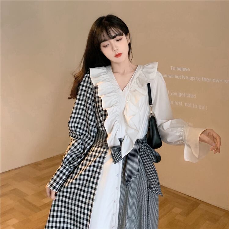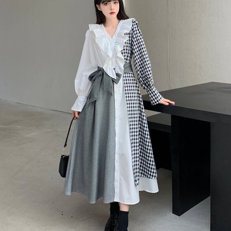 【送料無料】 フリルドレス ロング丈 長袖 パフスリーブ Vネック フリルネック Aライン フレアスカート アシンメトリー チェック柄 ウエストマーク ウエストリボン 個性的 大人可愛い 大きいサイズ 春 お呼ばれ 二次会