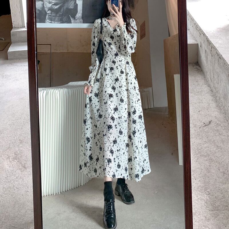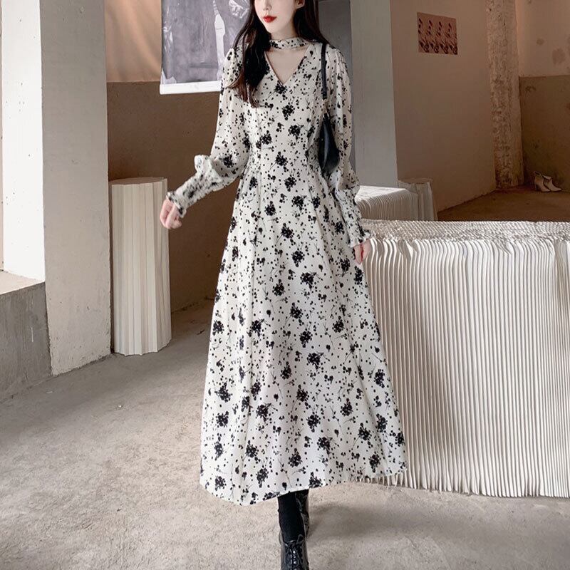 【送料無料】 シフォンドレス ロング丈 Vネック 長袖 パフスリーブ ハイウエスト Aライン フレアスカート 花柄プリント 上品 エレガント 10代 20代 30代 40代 大きいサイズ お呼ばれ 二次会 パーティードレス