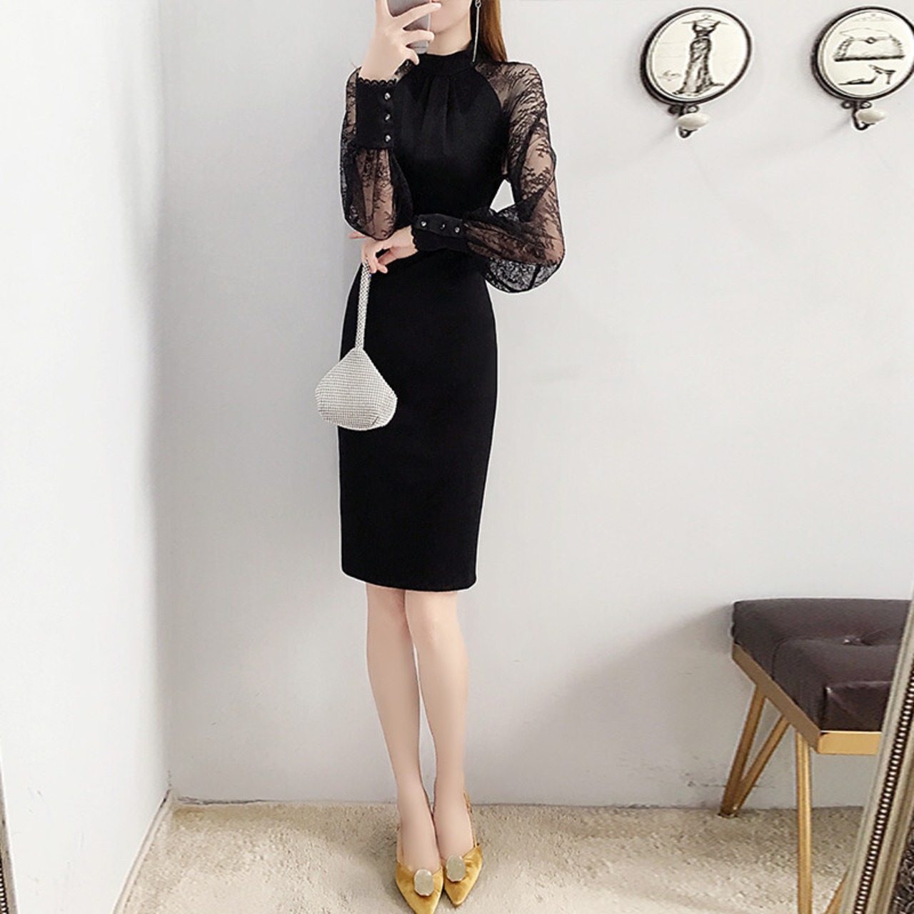 【送料無料】 パーティードレス ドレス レディース 膝丈 長袖 シースルー袖 ボトルネック パフスリーブ タイトドレス スリム レース 透け感 ミニ丈 黒 ブラック 大きいサイズ きれいめ 春 夏 秋 20代 30代 40代 無地 細見え 着痩せ 美脚 ミニドレス ミニ ワンピース タイト 袖あり 袖付き 襟無し レトロ スカート 大人可愛い おしゃれ かわいい お洒落 エレガント 上品 シフォン ふんわり セクシー 結婚式 お呼ばれ パーティー セレモニー 二次会 食事会 女子会 同窓会 かっこいい