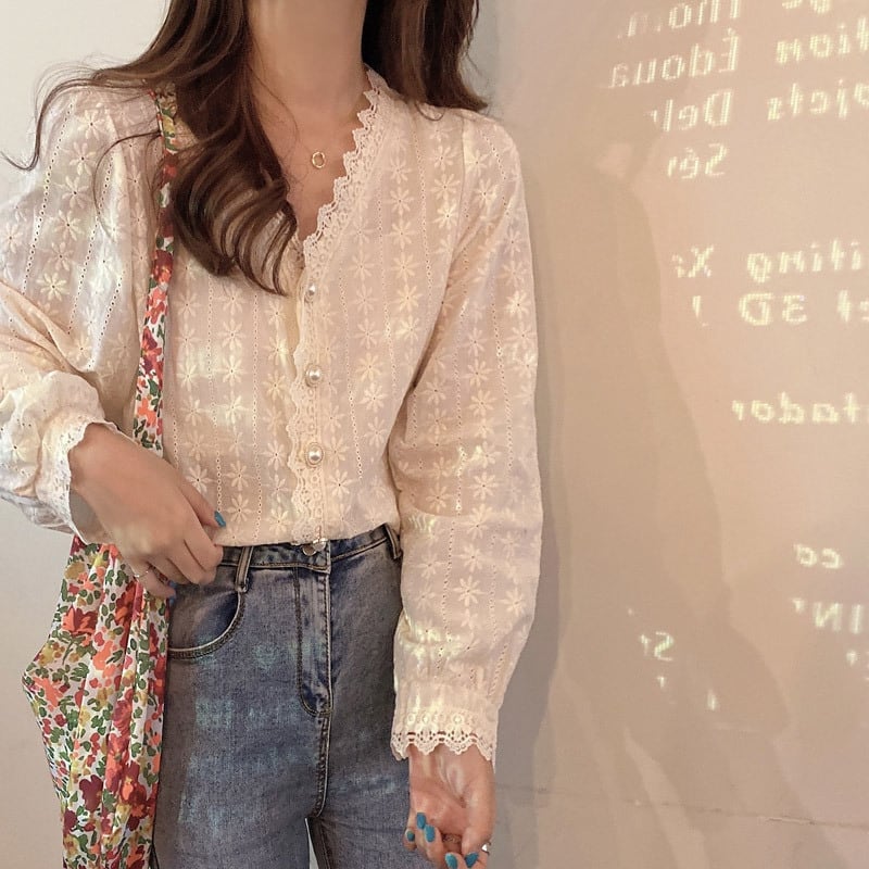 【送料無料】 トップス ブラウス Vネック レース 刺繍 エンブロイダリー ふんわり袖 ゆったり フラワー 花 長袖 エレガント 上品 大人可愛い レトロ 20代 30代 通勤 通学 オフィス お出かけ 春夏