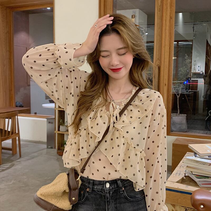 【送料無料】 トップス ブラウス ドット 水玉 フリル リボン ゆったり 体型 カバー ベージュ くすみカラー キュート スウィート 大人かわいい 通勤 通学 お出かけ 春夏
