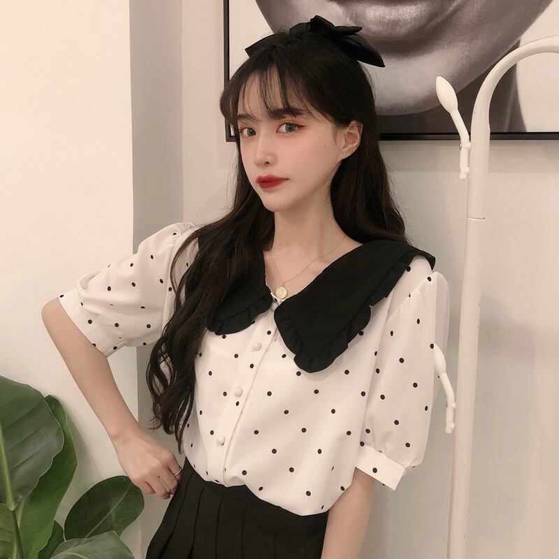 【送料無料】 トップス ブラウスドット 水玉 フリル モノトーン 黒 白 ブラック ホワイト キュート レトロ 半袖 半端袖 5分袖 20代 30代 通勤 通学 お出かけ 春夏