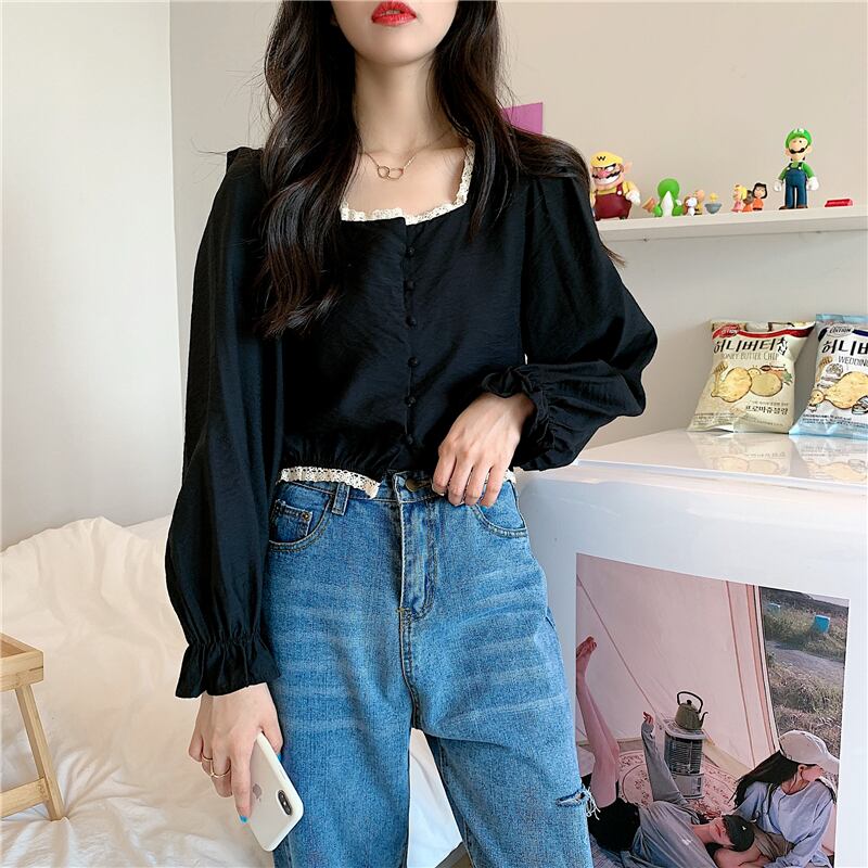【送料無料】 トップス ブラウス モノトーン レース シンプル レトロ 大人可愛い キュート ガーリー 黒 ブラック 長袖 スクエアネック 20代 30代 通勤 通学 お出かけ 春夏 秋