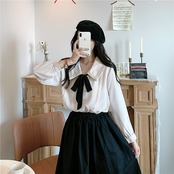 【送料無料】 トップス ブラウス リボン モノトーン 長袖 キレイ目 キュート 上品 レース 20代 30代 白 ベージュ 黒 ブラック ベーシック シンプル 通勤 通学 オフィス お出かけ 春夏