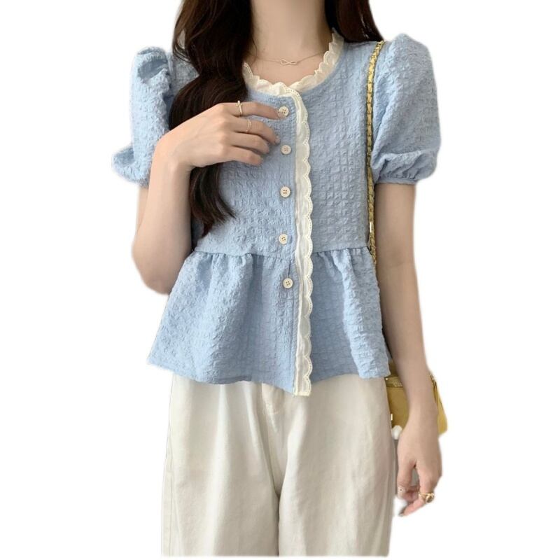 【送料無料】 トップス ブラウス ふんわり袖 レース ぺプラム キュート ウエストカバー 大人可愛い 清楚 青 白 黄色 ブルー ホワイト イエロー 20代 30代 通勤 通学 オフィス お出かけ 春夏