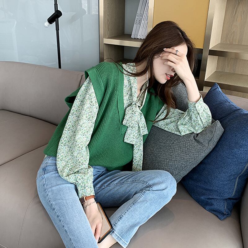 【送料無料】 トップス ブラウス フラワー 小花柄 プリントリボン 上品 清楚 シンプル 長袖 緑 グリーン ふんわり袖 ゆったり キレイめ 20代 30代 40代 通勤 通学 オフィス お出かけ 春夏 秋