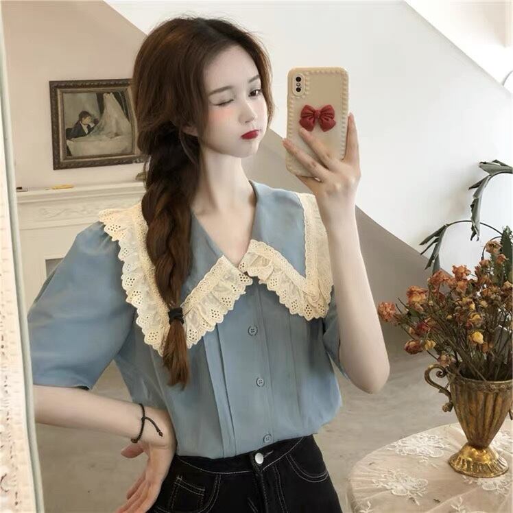 【送料無料】 トップスブラウス レース 大きめ襟 キュート スウィート ガーリー レトロ 半袖 青 黒 ブルー ブラック 20代 30代 通勤 通学 お出かけ 春夏