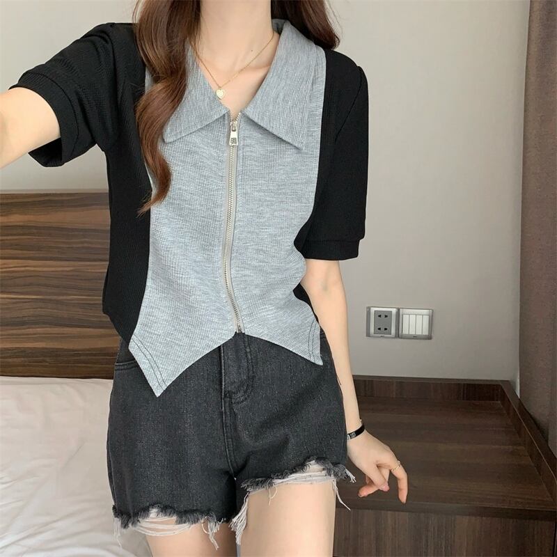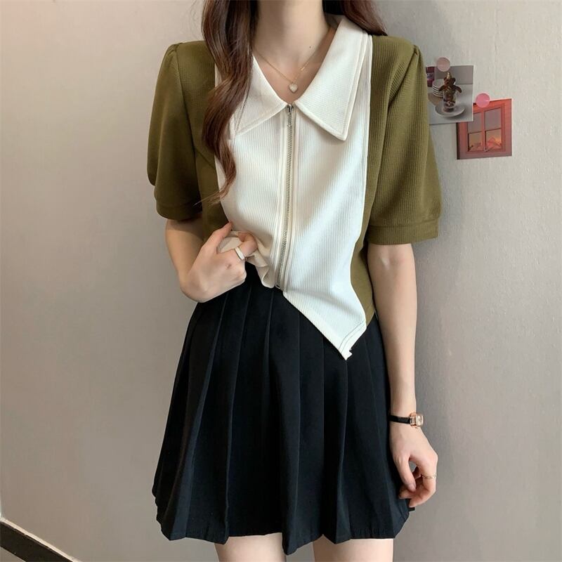 【送料無料】 トップス カットソー カラー切り替え フロントファスナー ジップアップ カジュアル 半袖 ホワイト グリーン グレー ブラック 白 黒 20代 30代 40代 通勤 通学 お出かけ 春夏