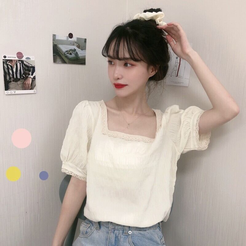【送料無料】 トップス ブラウス スクエアネック レース ふんわり袖 ボリューム袖 フェミニン 上品 レトロ 20代 30代 半袖 ベージュ 通勤 通学 オフィス お出かけ 春夏