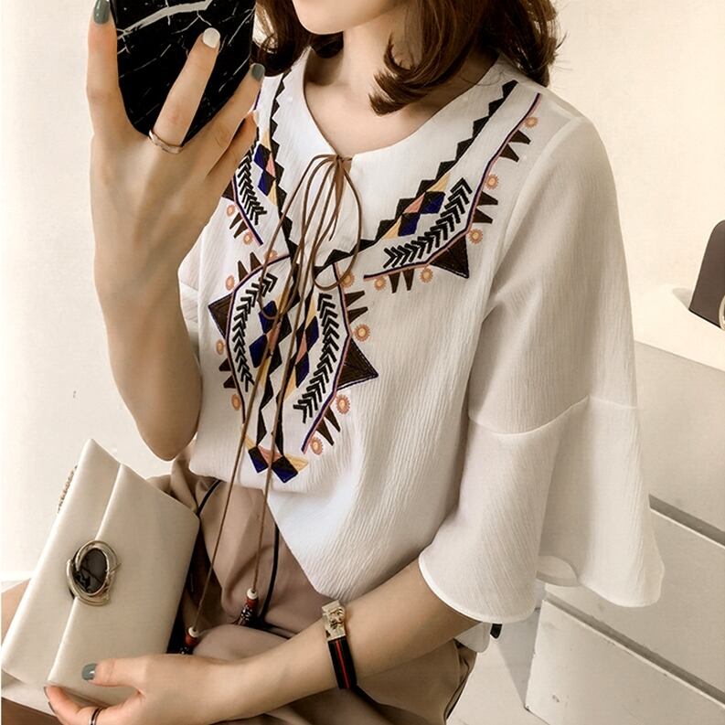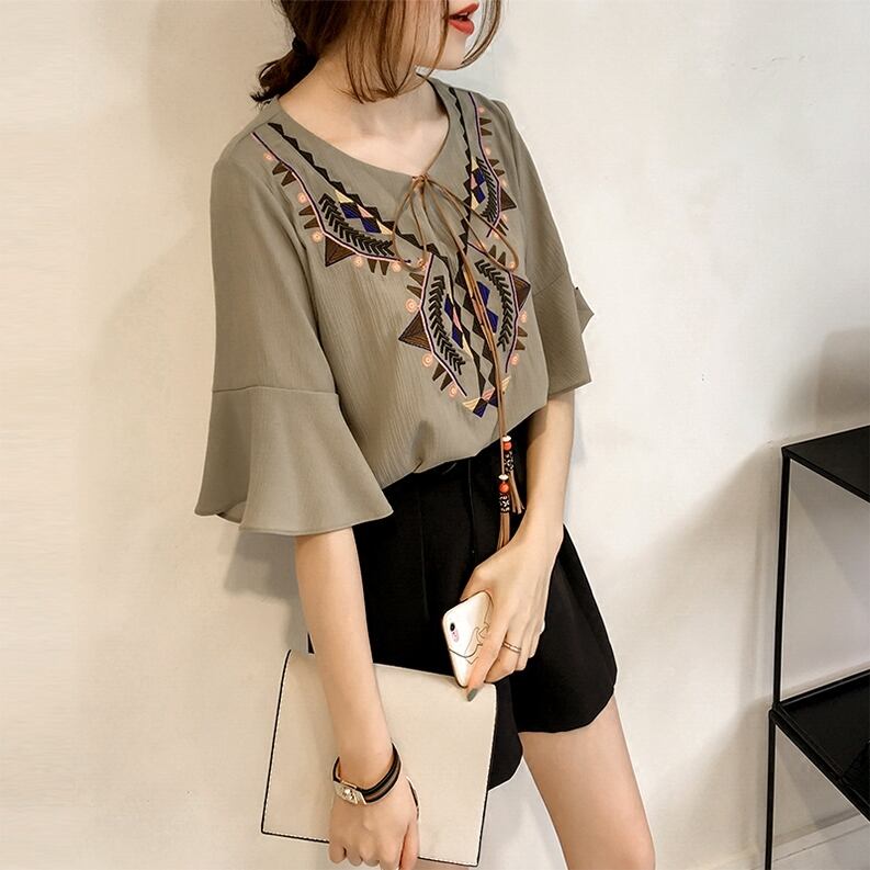 【送料無料】 トップス ブラウス エスニック ふんわり袖 フレアスリーブ キーネック ナチュラル 半端袖 5分袖 カジュアル 20代 30代 40代 通勤 通学 お出かけ 春夏