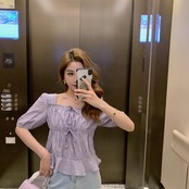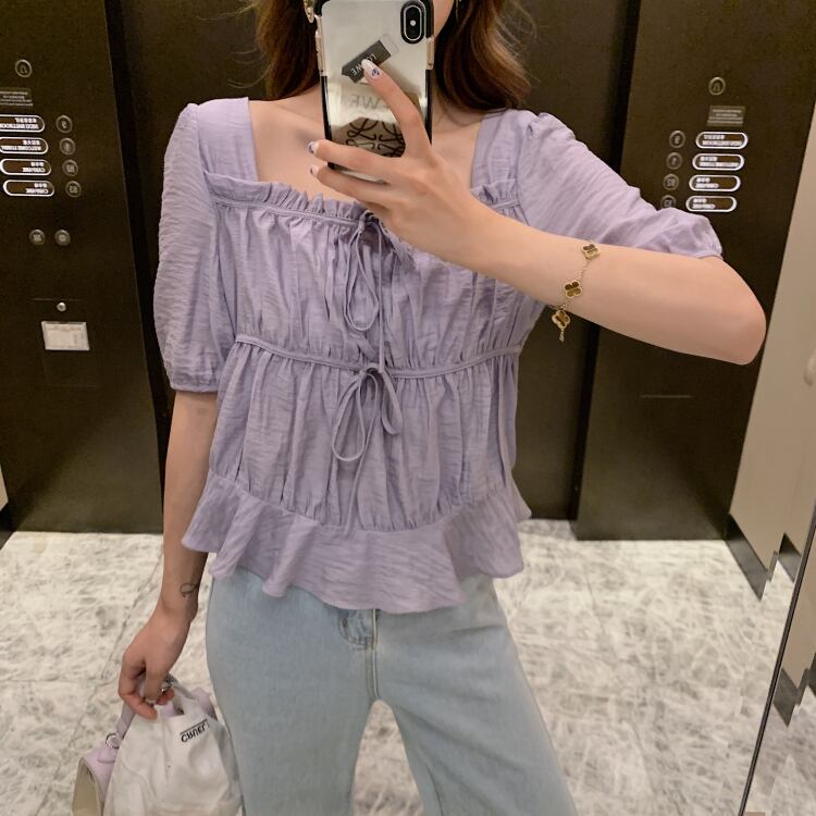 【送料無料】 トップス ブラウス シャーリング ギャザー リボン スクエアネック キュート 大人かわいい カジュアル 上品 紫 パープル 20代 30代 40代 通勤 通学 オフィス お出かけ 春夏