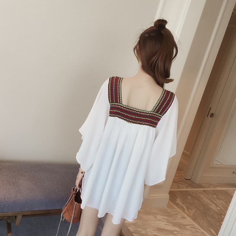【送料無料】 トップス ブラウス カットソー チュニック スクエアネック エスニック ギャザー キュート 大人かわいい フレアスリーブ 黒 白 ブラック ホワイト 半端袖 5分袖 20代 30代 40代 通勤 通学 オフィス お出かけ 春夏