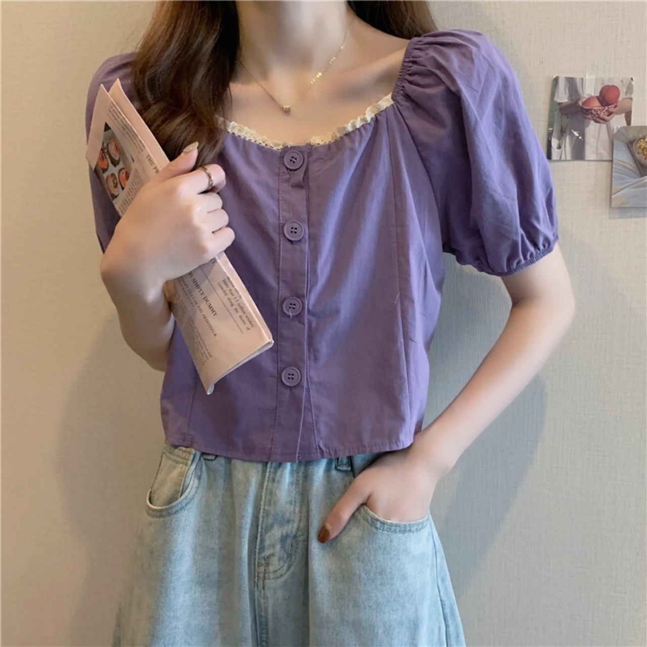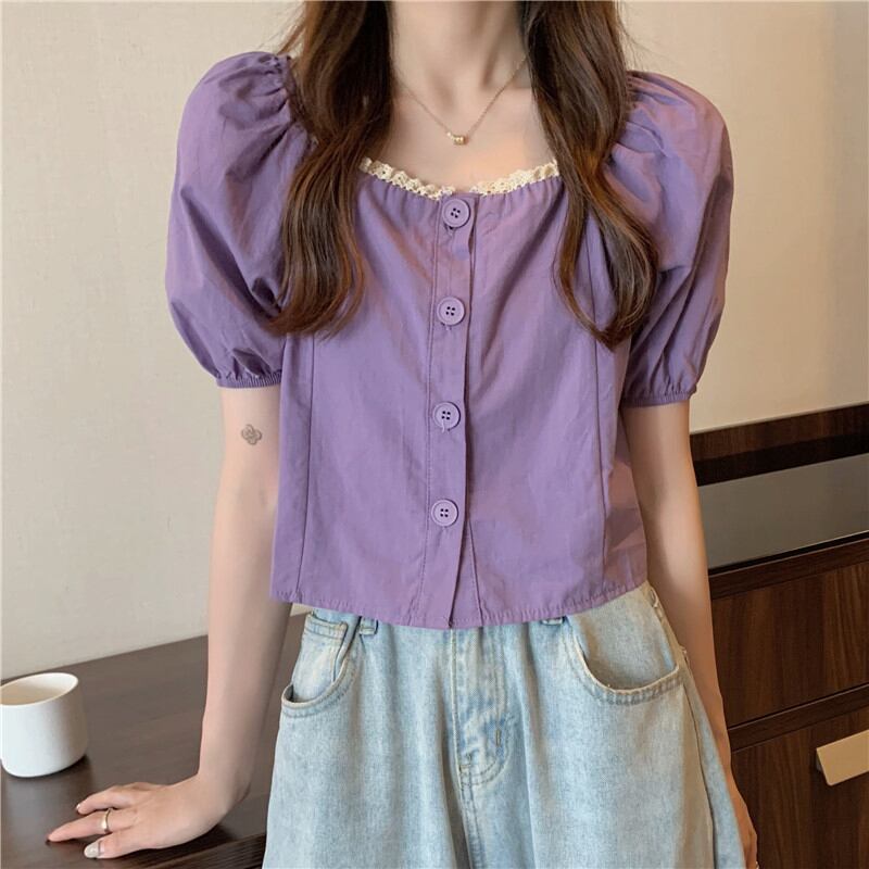 【送料無料】 トップス ブラウス キュート ガーリー レース ふんわり袖 清楚 上品 クロップド丈 半袖 パープル 紫 スクエアネック 20代 30代 40代 通勤 通学 オフィス お出かけ 春夏