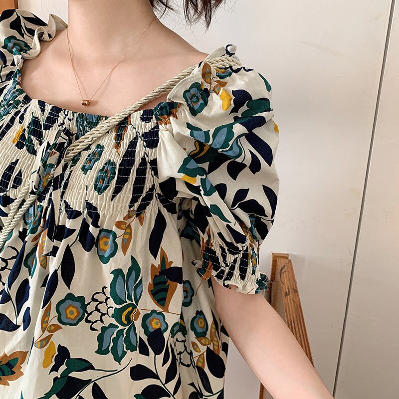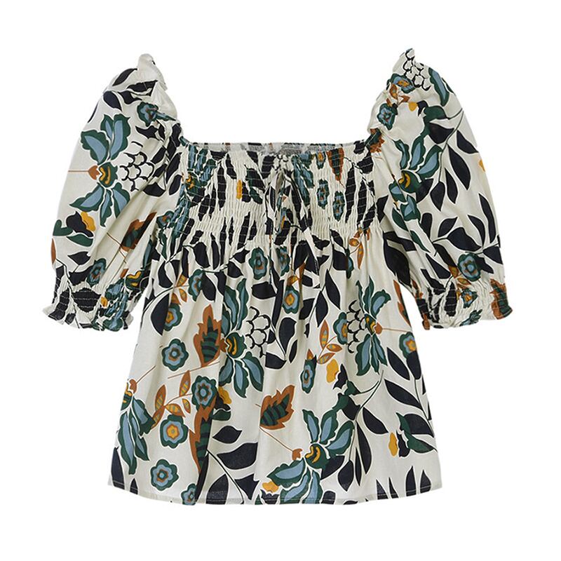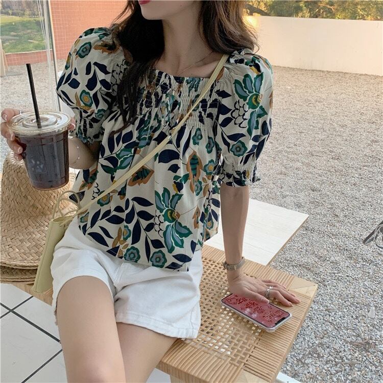 【送料無料】 トップス ブラウス シャーリング ふんわり袖 フラワー ボタニカル プリント 華やか 清潔感 カジュアル キレイめ 北欧 半袖 白 青 緑 オレンジ マスタード ホワイト ブルー グリーン 20代 30代 40代 通勤 通学 オフィス お出かけ 春夏